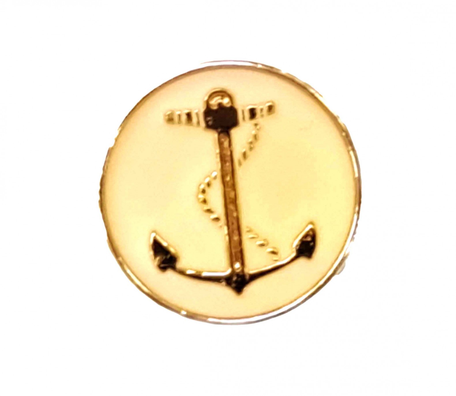 De knoop heeft een gouden anker in een ivoorkleurig vlak en een gouden rand
