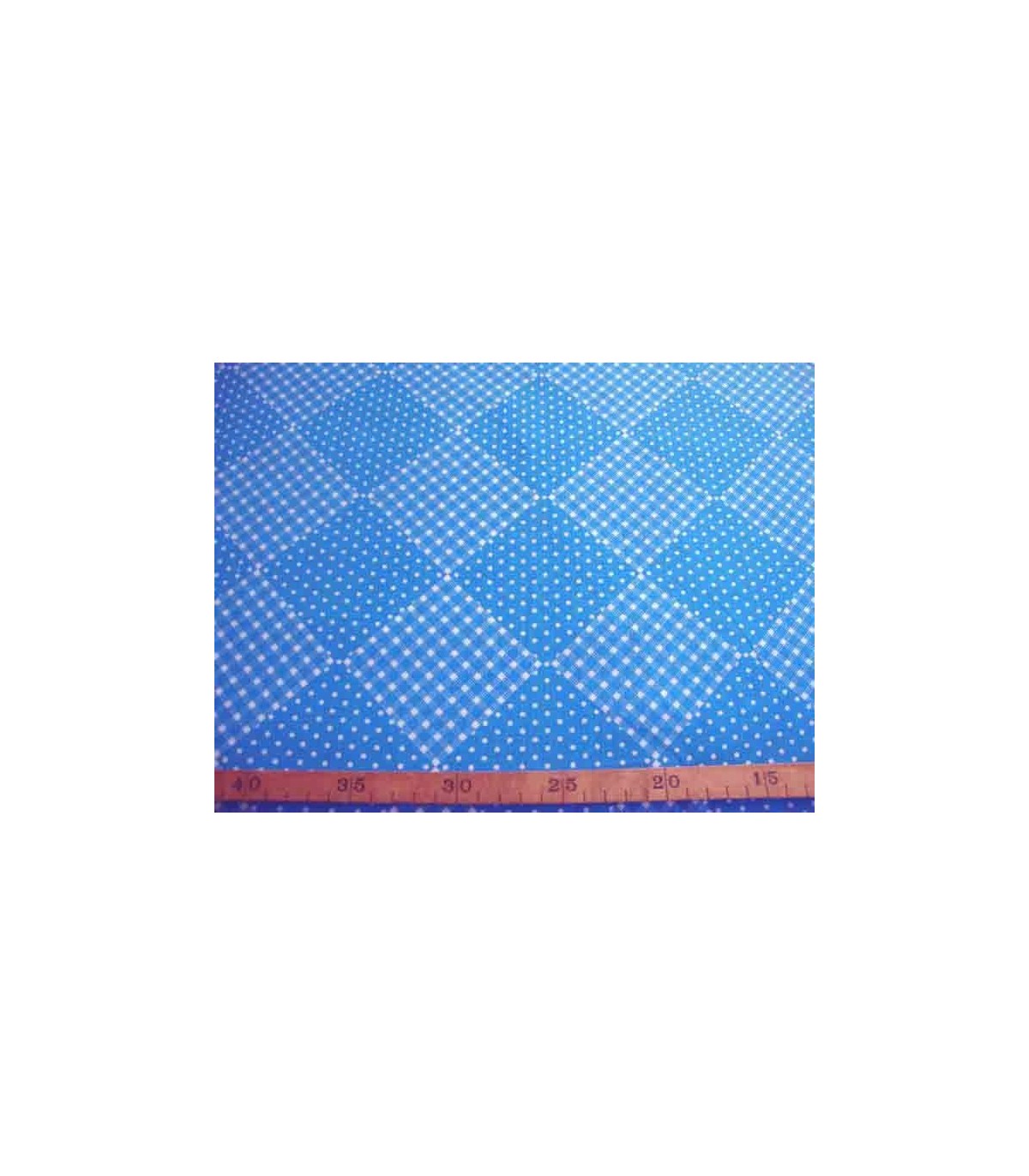 Een aquakleurige katoen met een wybertjes print met stippen en boerenbont ruitjes.