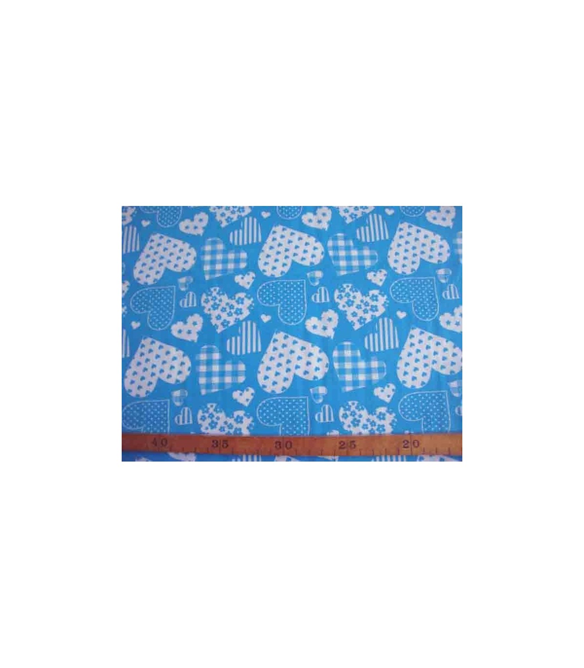 Aquakleurig bedrukte katoen met een wit hartjes motief.