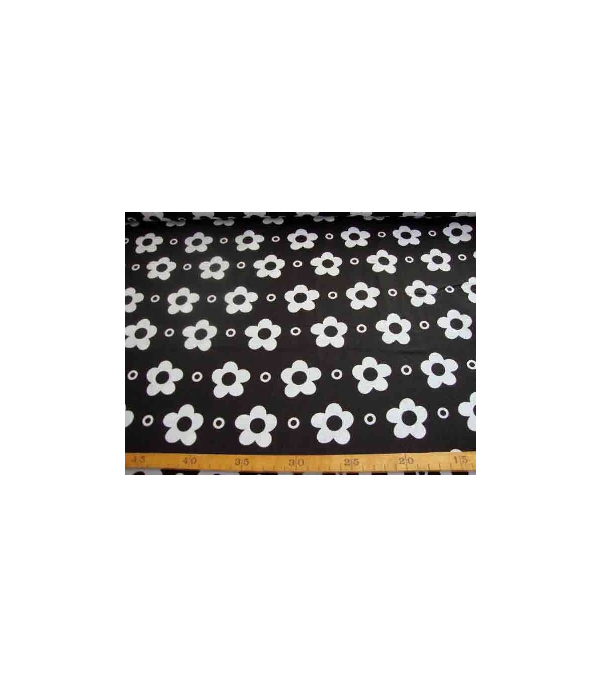 Een zwarte katoen met een grote witte bloemprint en cirkels.