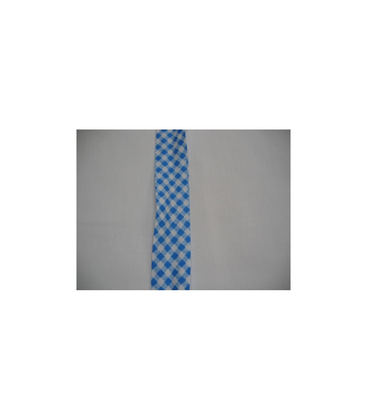Lichtblauw geblokt biaisband. 100% katoen 2 cm. breed