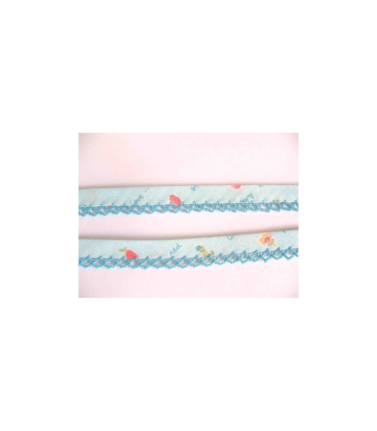 Biaisband licht aqua met aardbei, bloem en aquakleurige ruche.