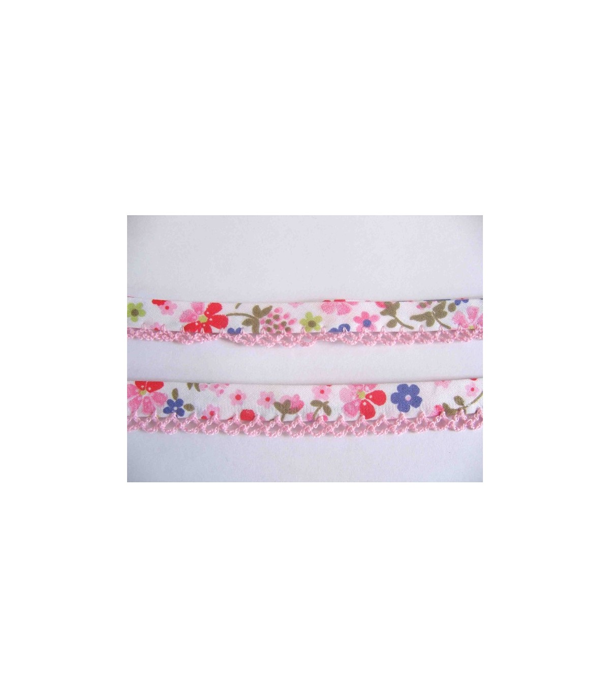 Biaisband wit met veelkleurige bloemen en een roze ruche.