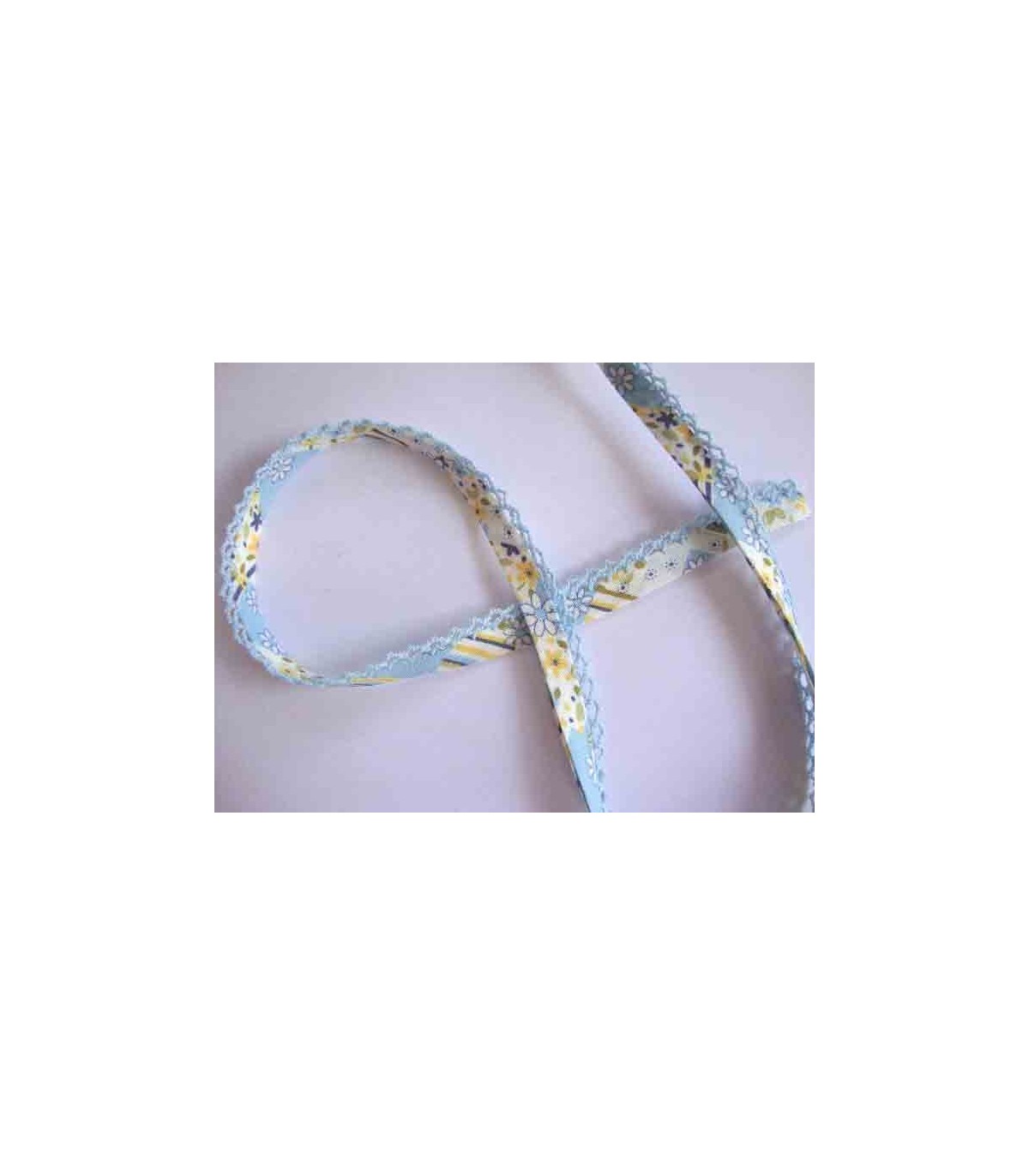 Biaisband met een lichtblauwe ruche, bloemen en streepjes.