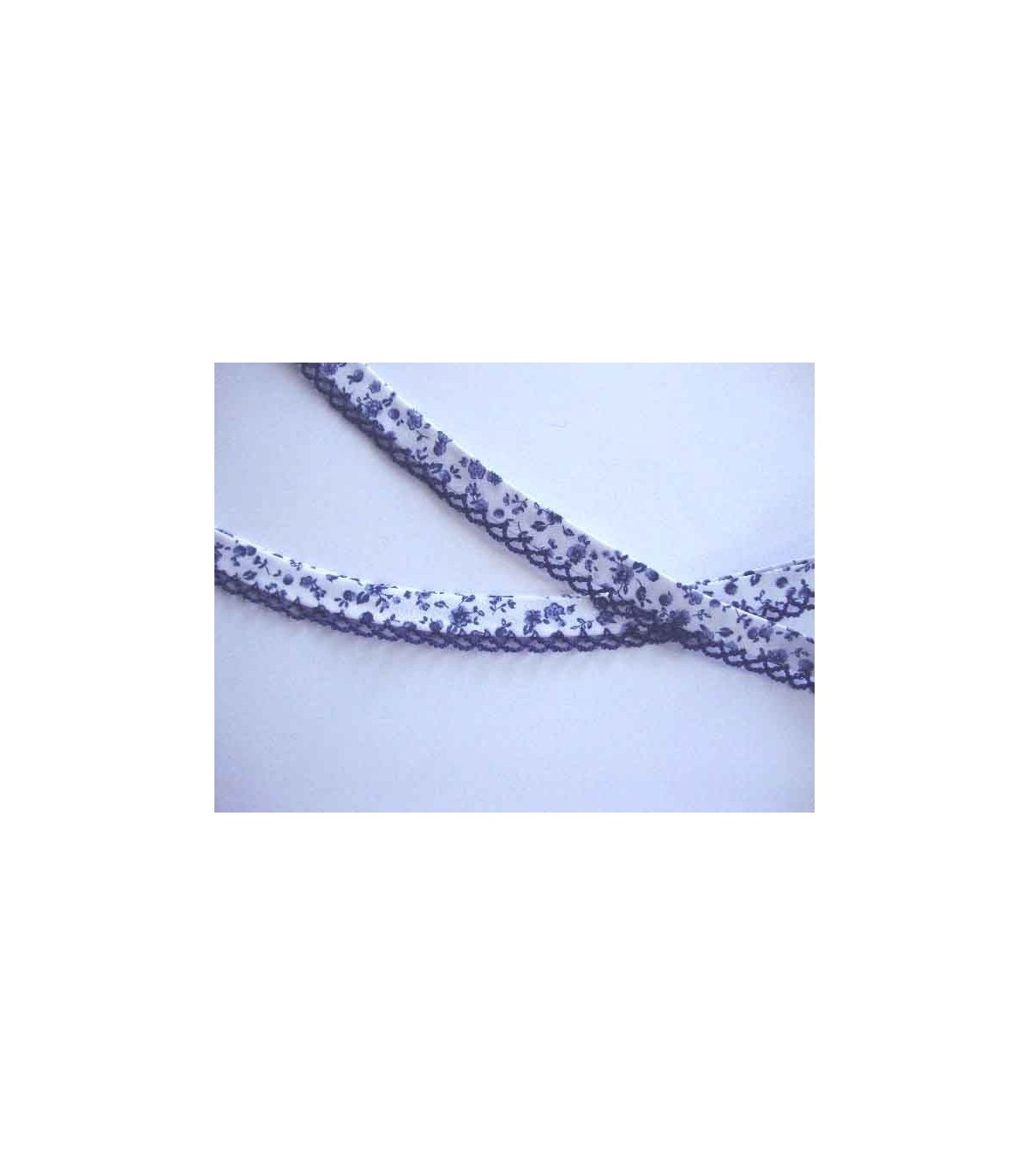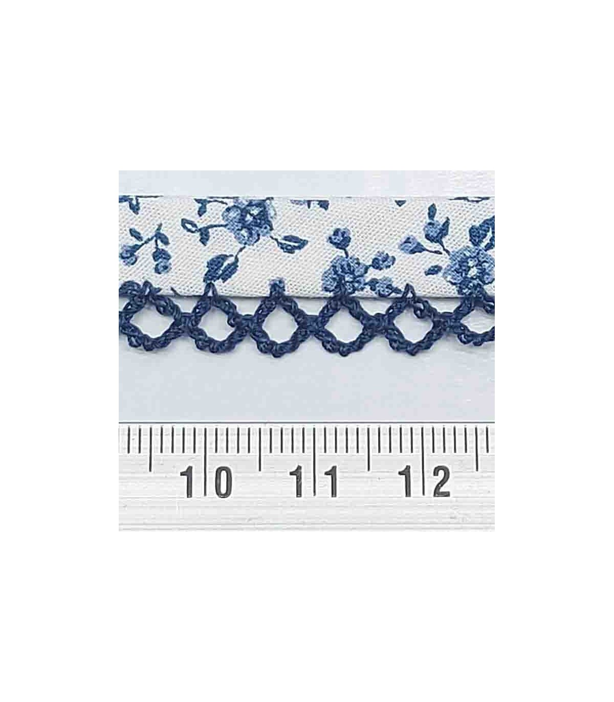 Biaisband wit met een jeansblauwe ruche en een blauwe bloemprint.