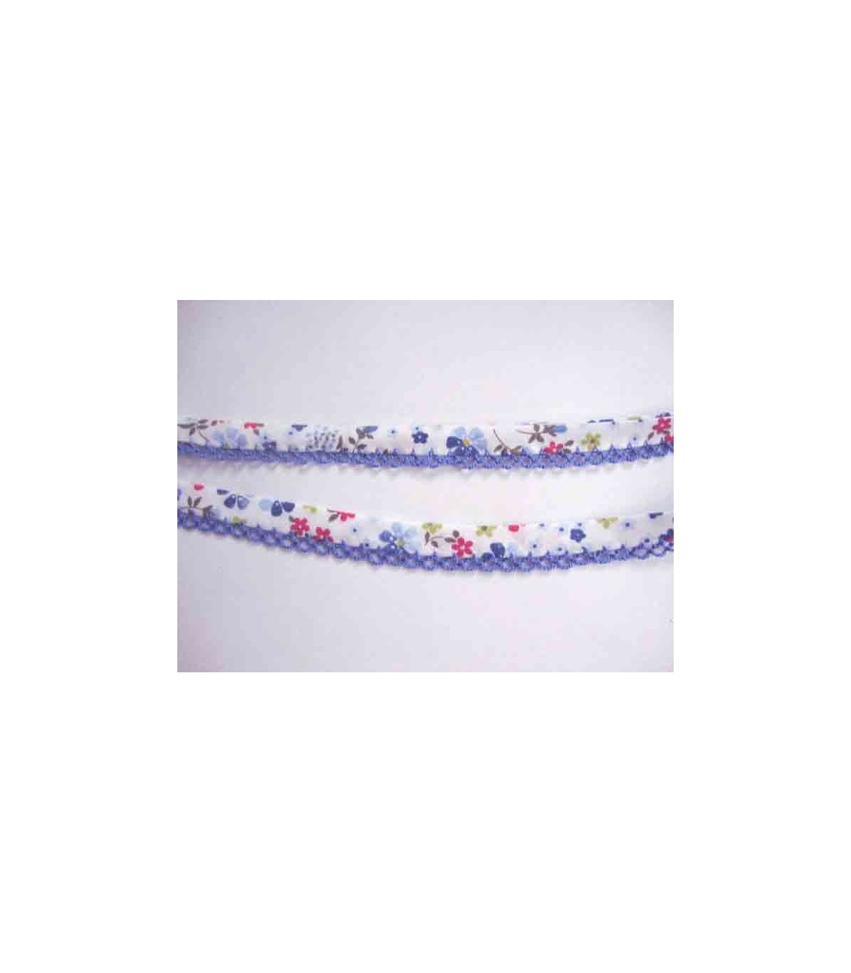 Biaisband wit met een blauwe ruche en een bloemprint.