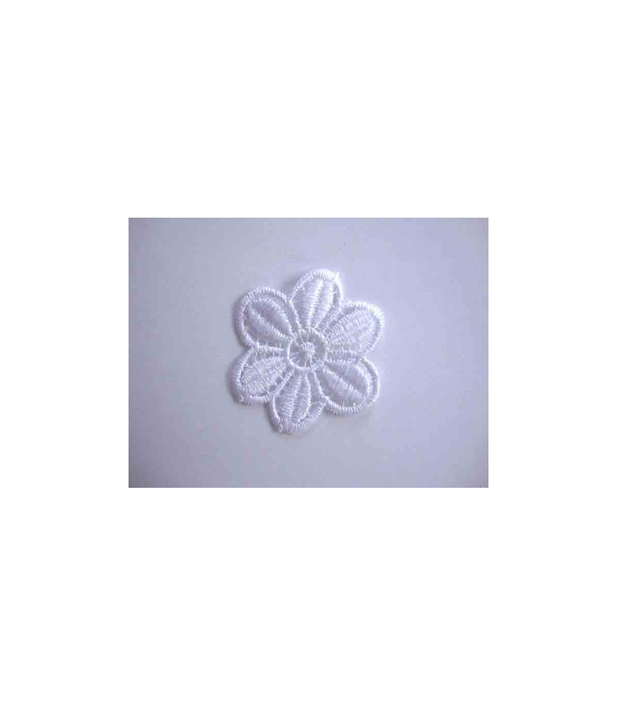Een opnaaibare witte bloemapplicatie met een doorsnee van 50 mm