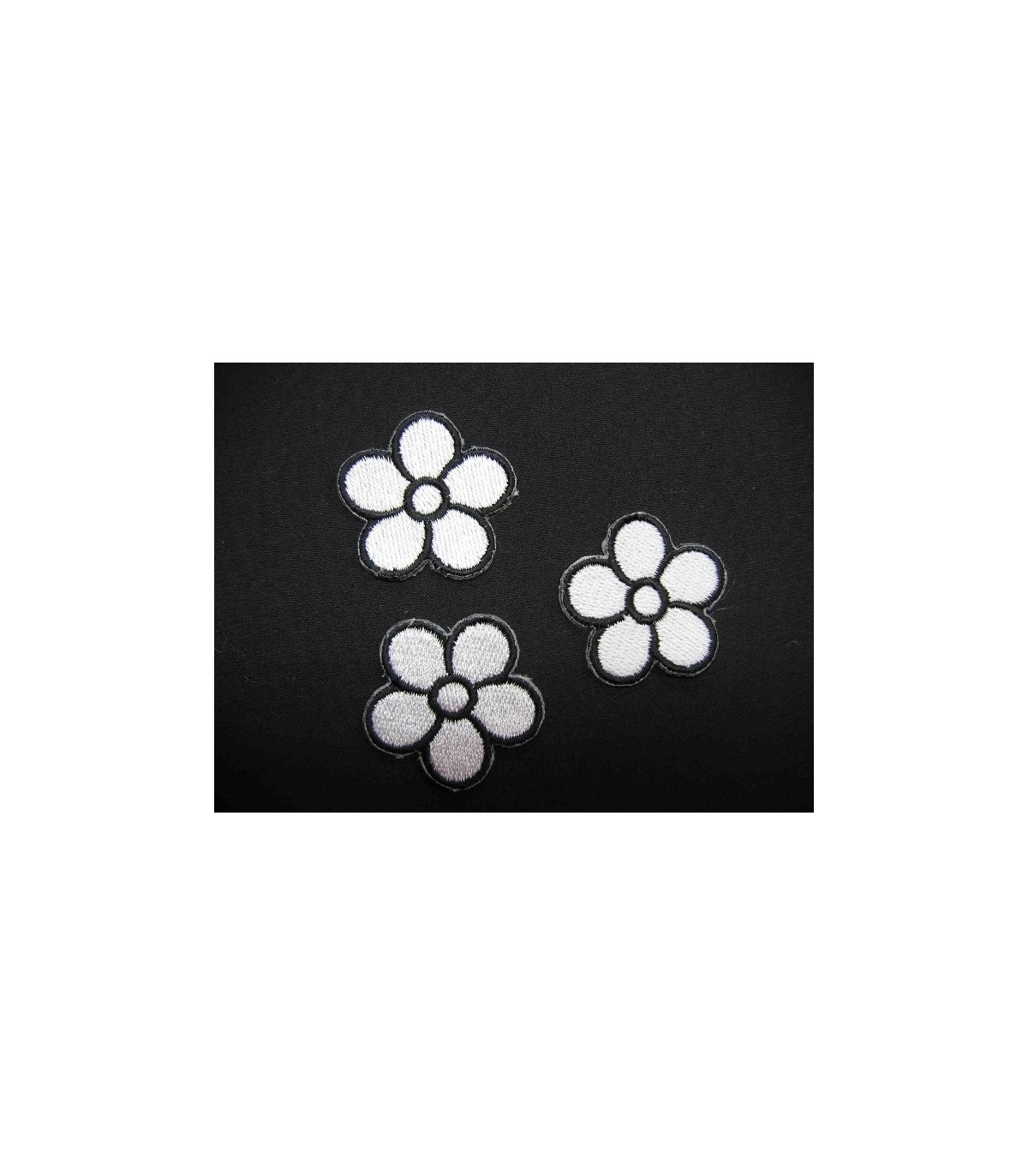 Witte bloem applicatie met een zwart randje. opstrijkbaar 3.5 cm. doorsnee.