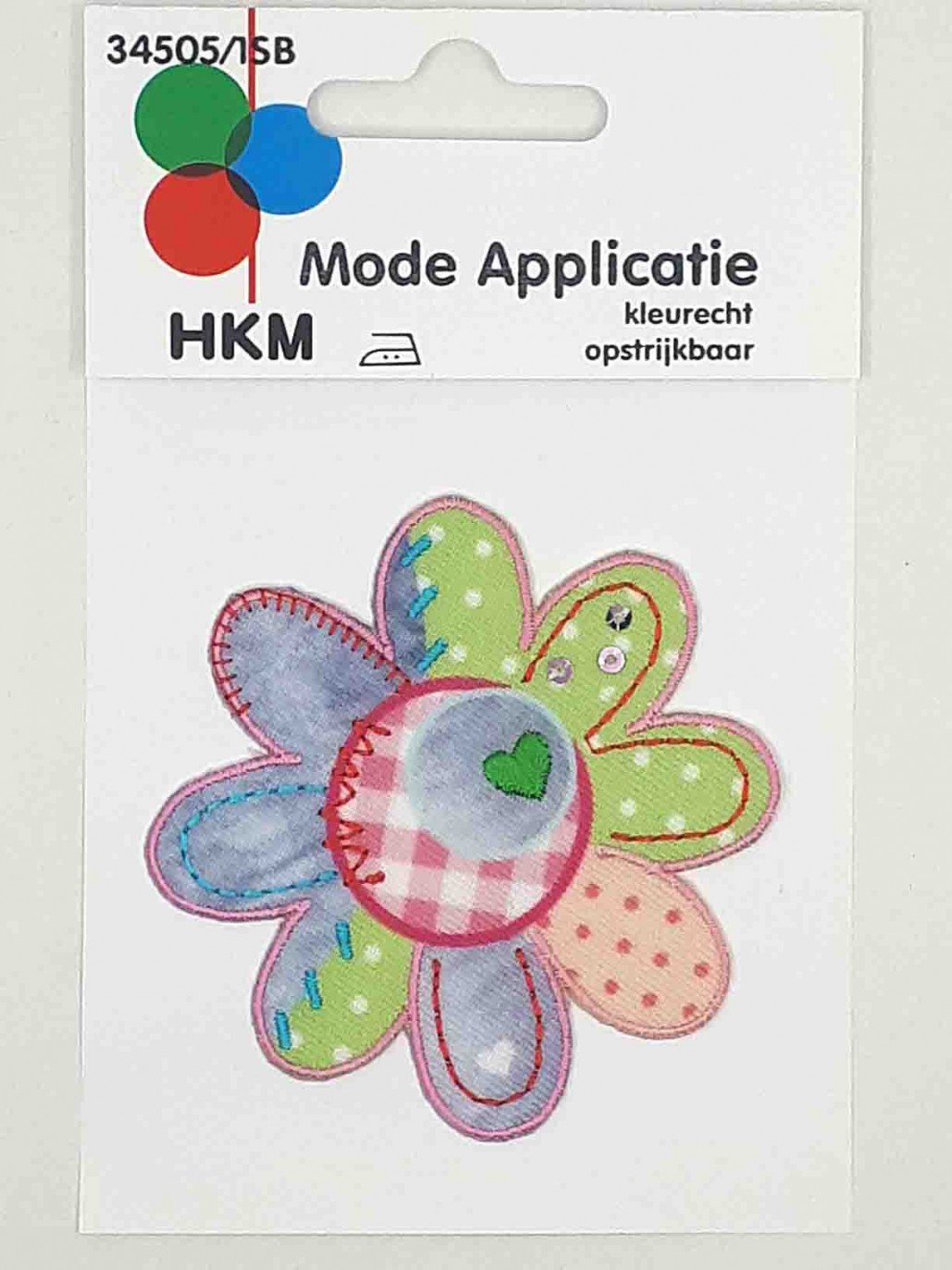 Een opstrijkbare bloem applicatie met een patchwork print.