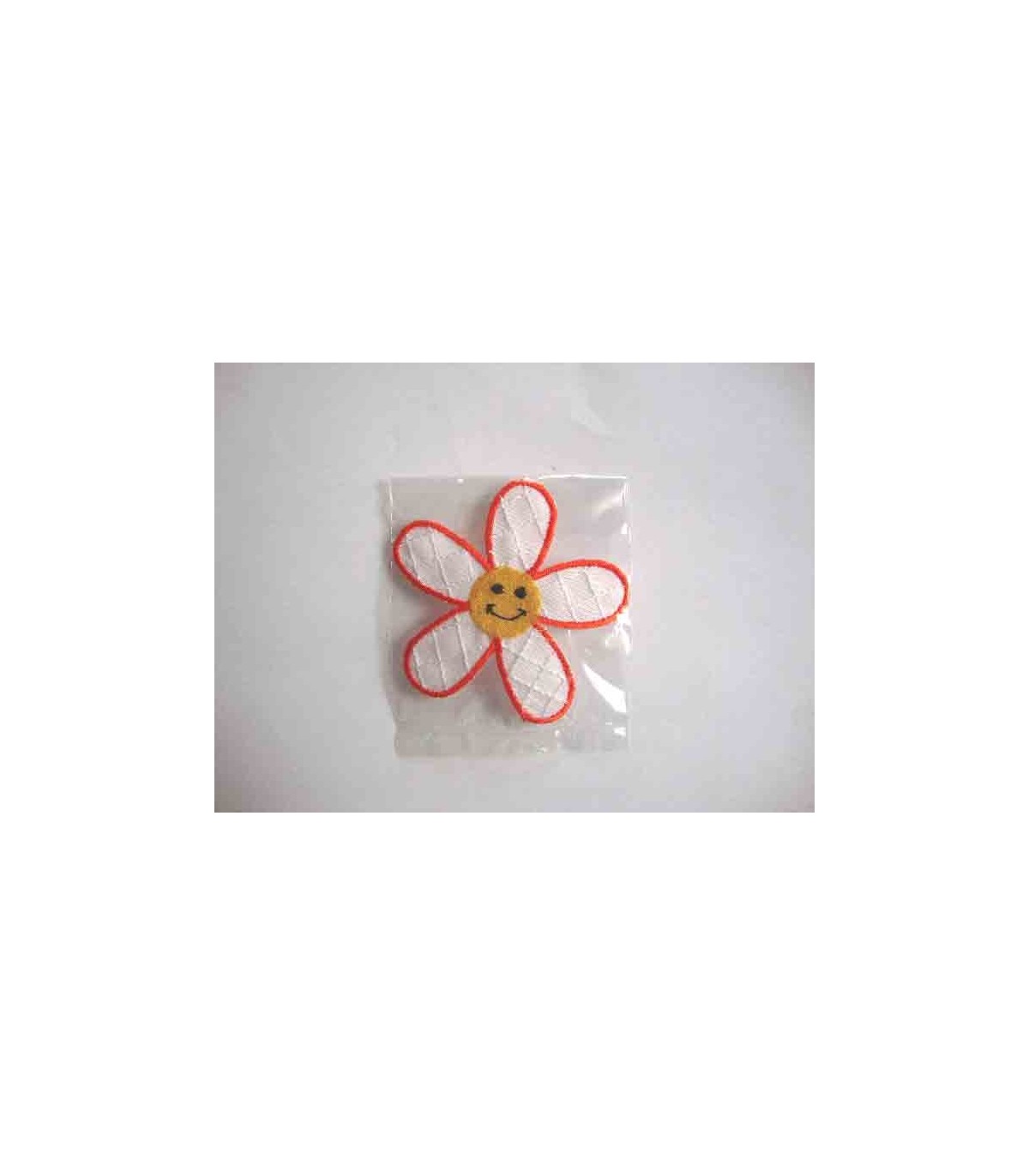 Wit/oranje opstrijkbare bloem applicatie met een geel gezichtje. Doorsnee 6 cm.