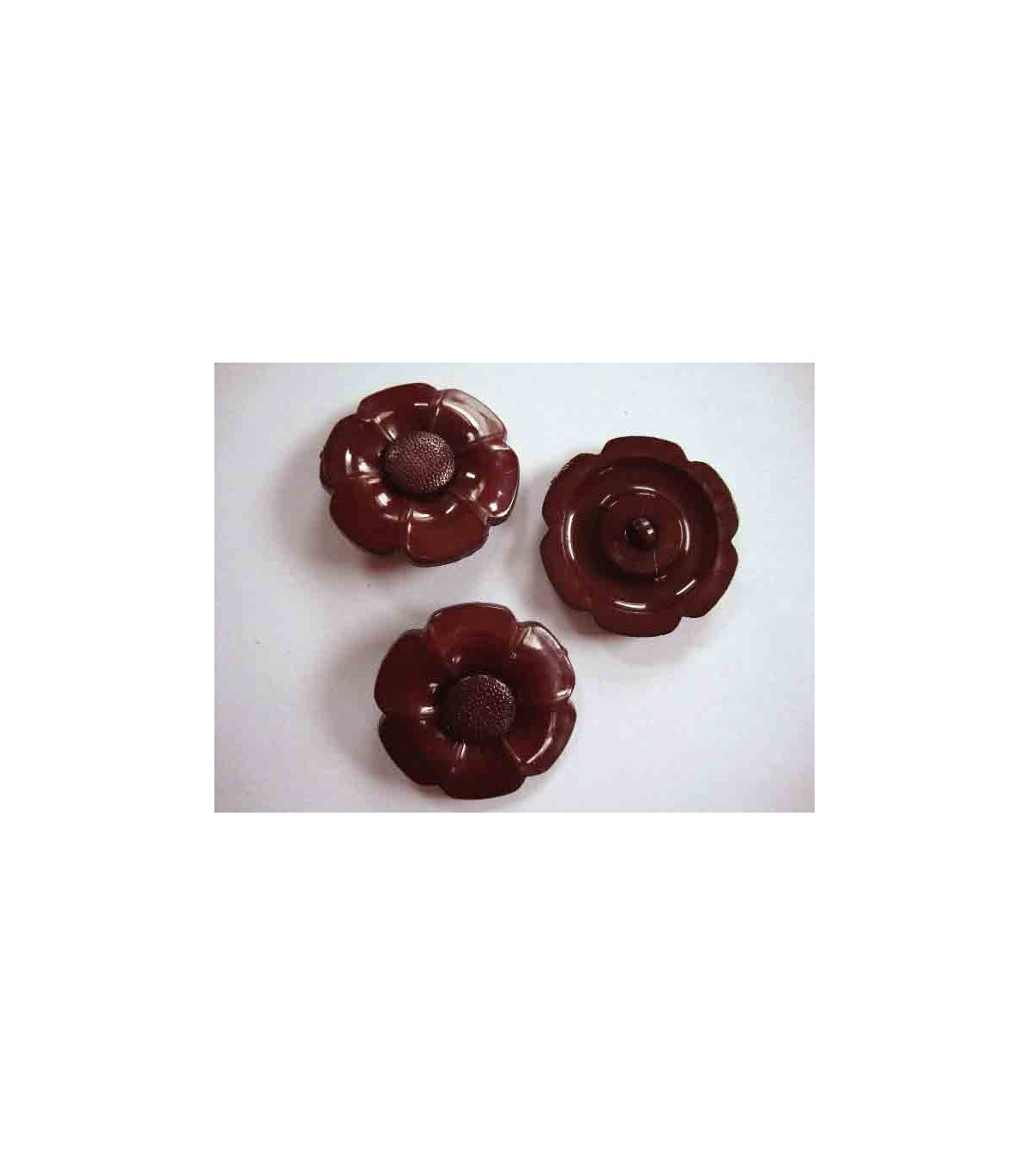 Een donkerbordeau kleurige bloemknoop met een wisselbaar hart. Doorsnee 35 mm. Zo kunt u van 2 knopen van dezelfde maat, een tweekleurige knoop maken.