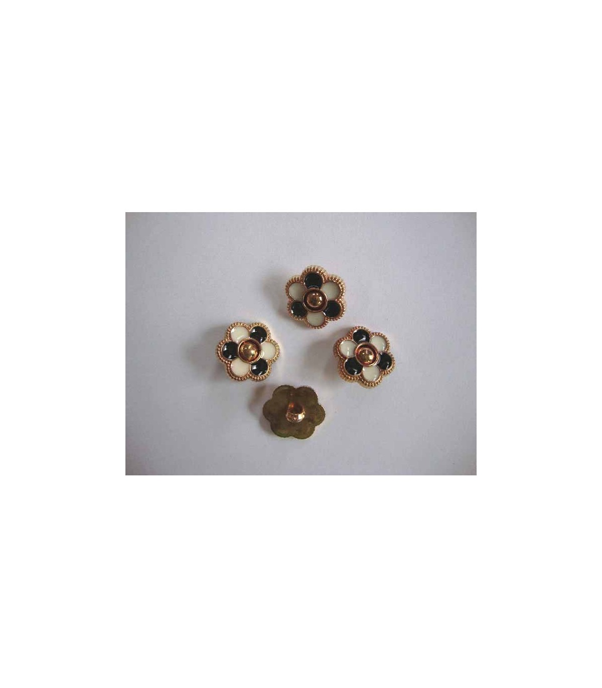 Een goudkleurige kunststof bloemknoop met 2 kleurige zwart/witte bloem met een doorsnee van 20mm.