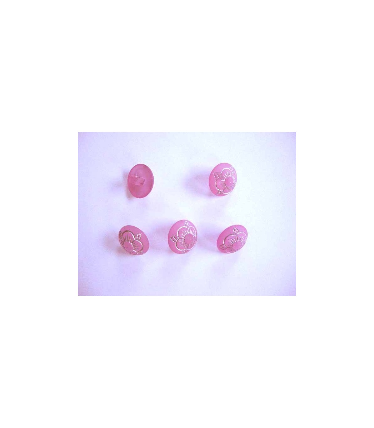 Een roze kunststof knoop met een grijze bloem opdruk en een doorsnee van 12 mm.