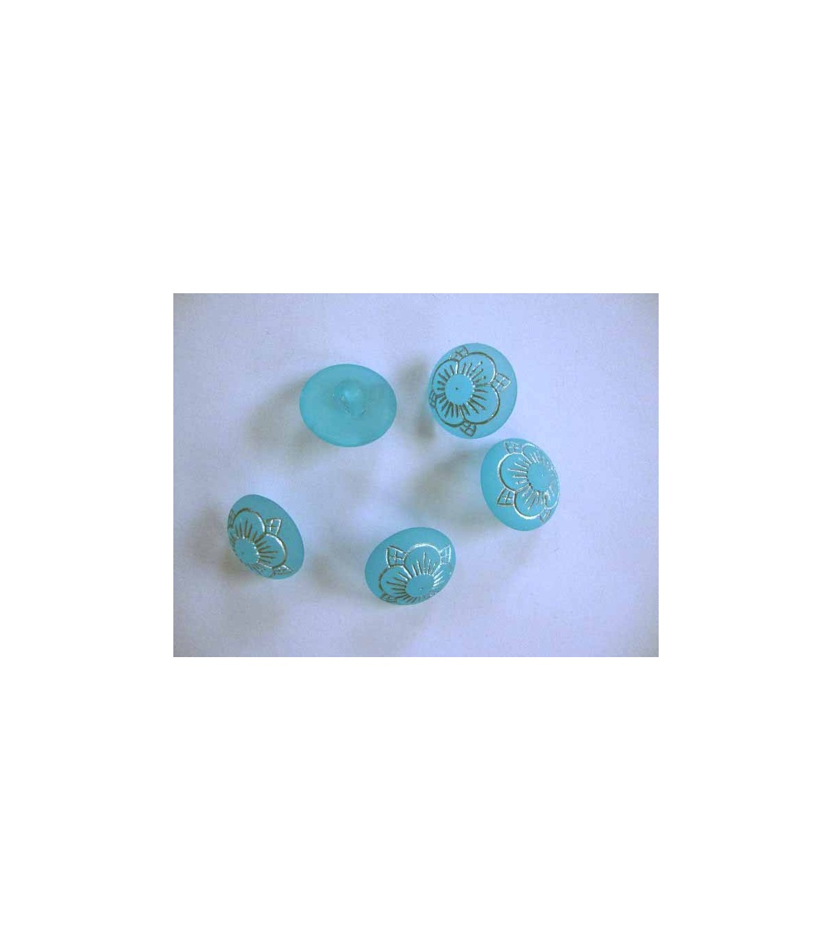 Een aqua kleurige kunststof knoop met een grijze bloem opdruk en een doorsnee van 15 mm.