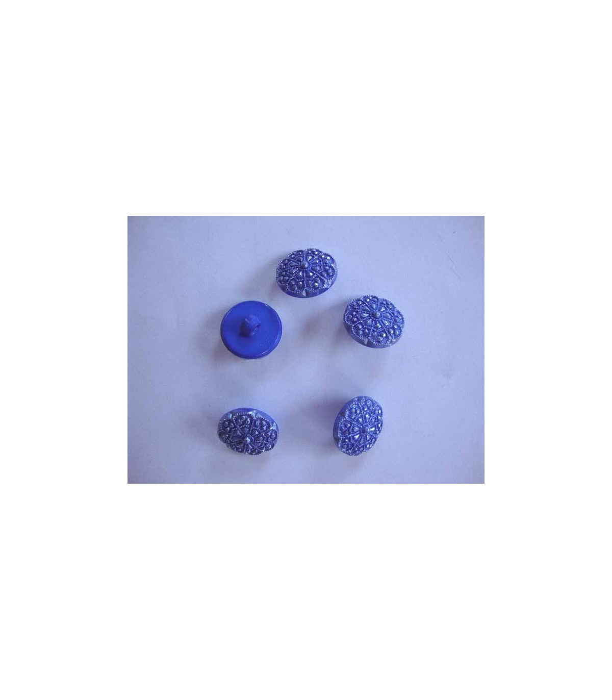 Een kobaltkleurige kunststof bloemknoop met een doorsnee van 15 mm.