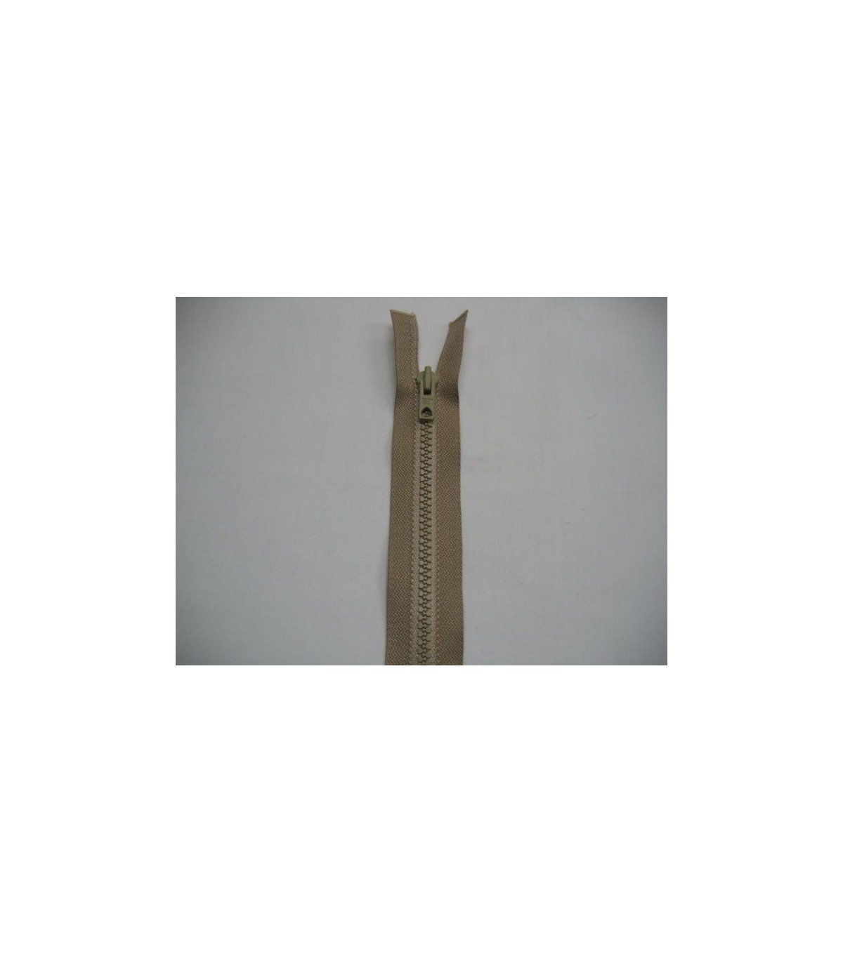 Een zandkleurige blokrits met grijze tandjes. 15 cm. lang.