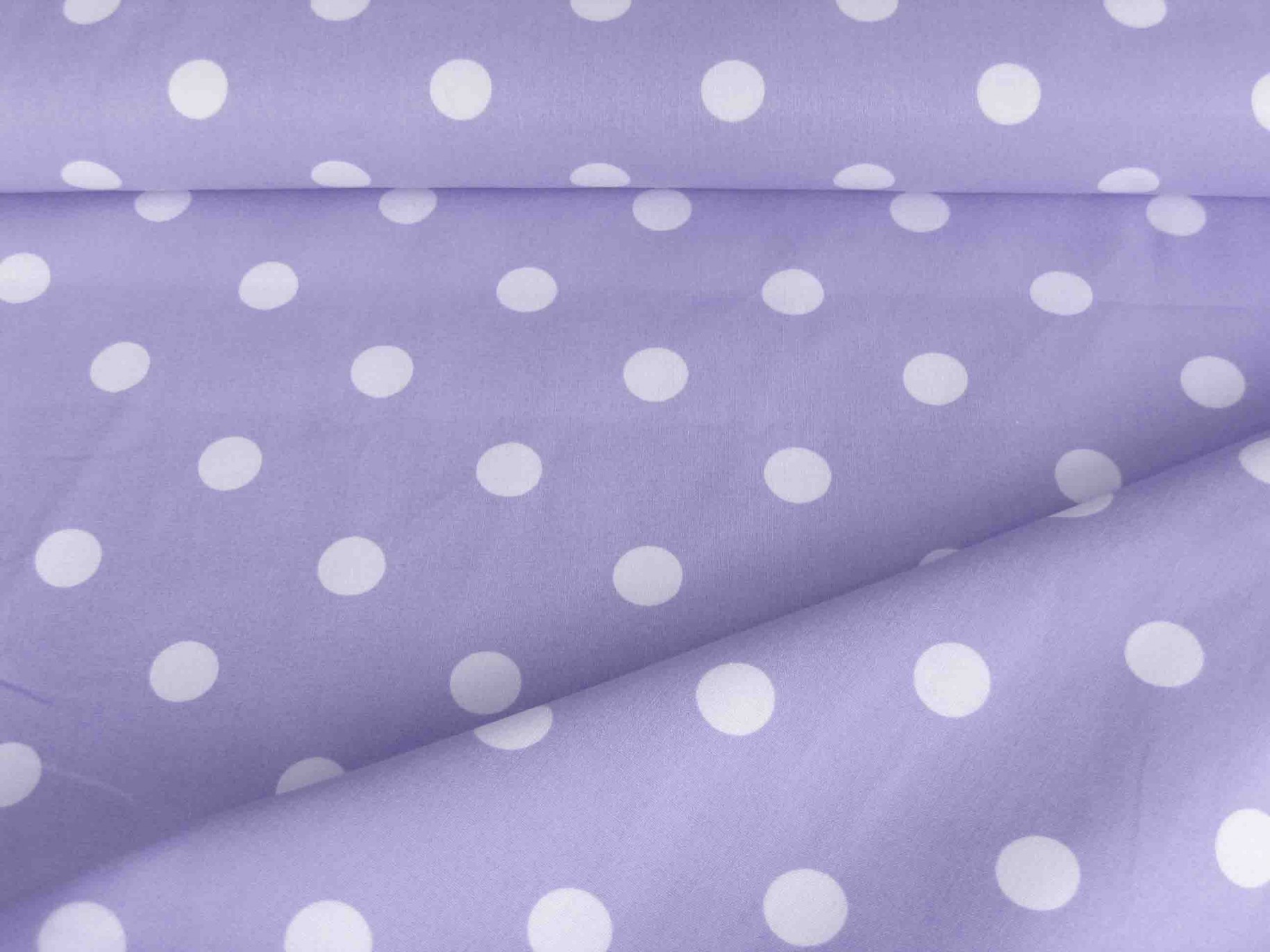 Lichtblauw bedrukt katoen met witte grote stippen. Doorsnee stip 18 mm.
