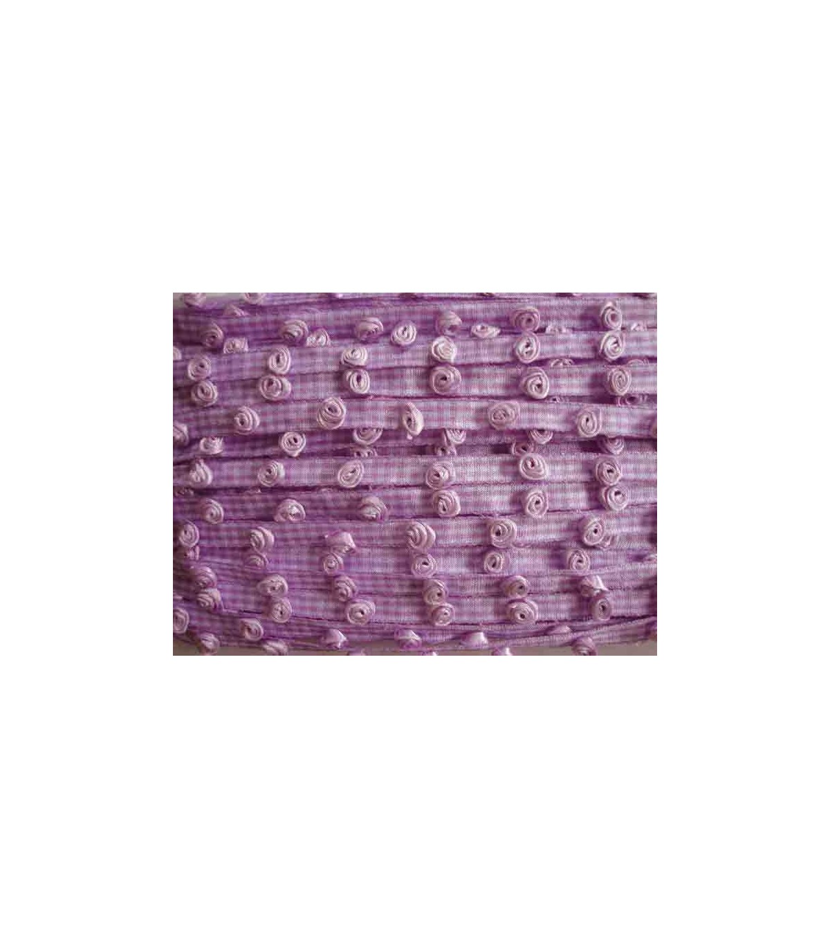 Lilakleurig boerenbont sierlint met lila roosjes. 4 roosjes op 10 cm