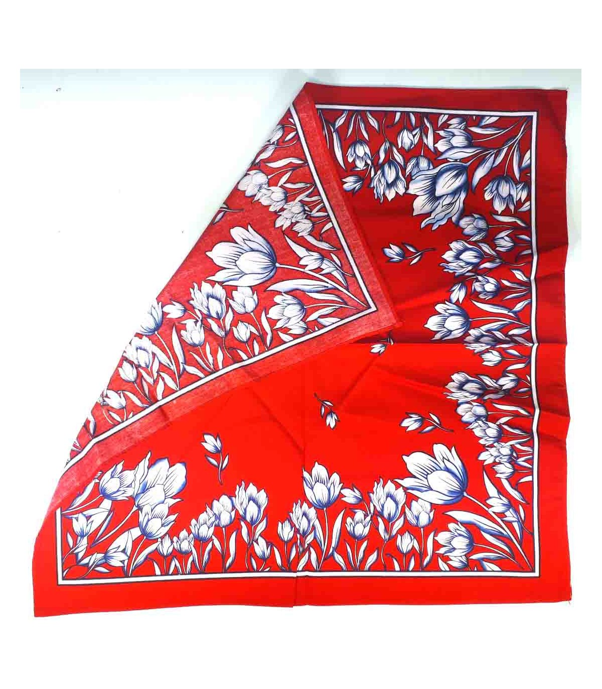 Boerenzakdoek rood met tulpen. Omgezoomd, dus kant en klaar.