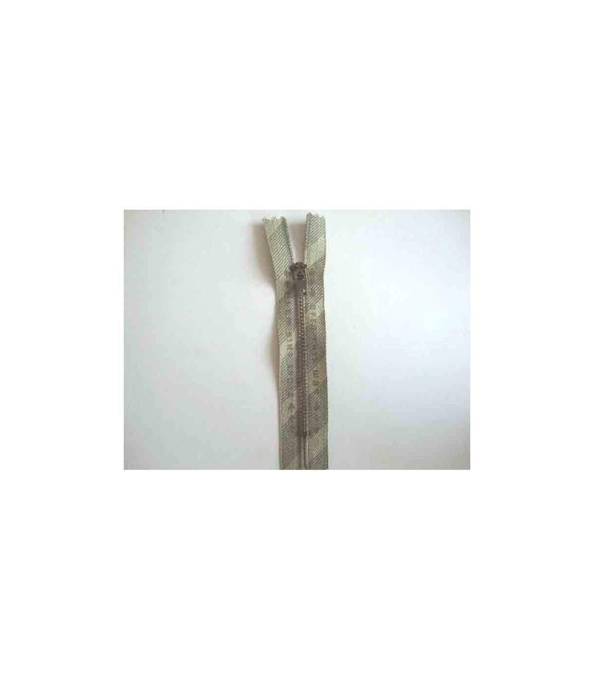 Een broekrits met fijne oudgoud kleurige metalen tandjes en met een zandkleurige tekst.