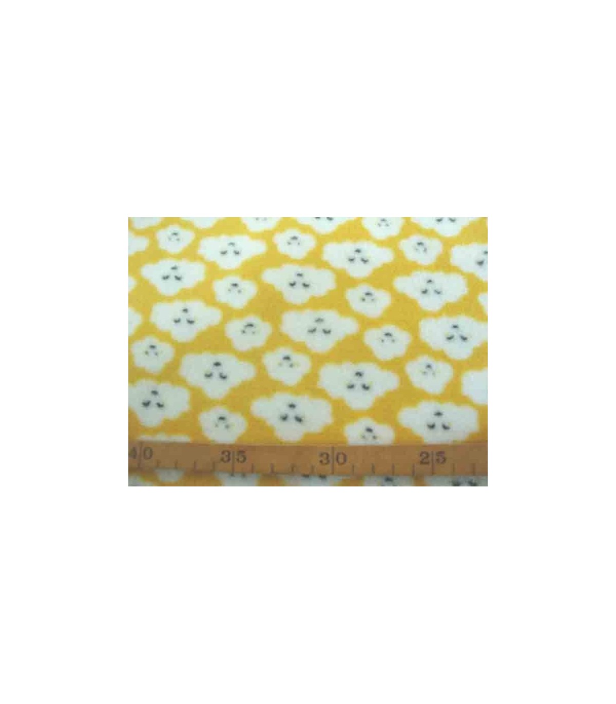 Coral fleece kanariegeel met witte poedelkopjes. Aan 2 kanten superzachte rekbare fleece. Deze fleece moet wel afgewerkt worden.
