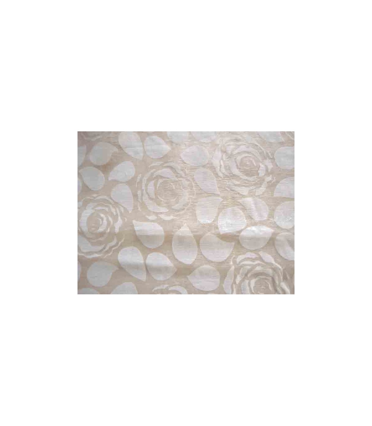 Een iets glanzende, doorschijnende offwhite stof met bloem. Een mooie stof die moet worden verwerkt met een onder stof.