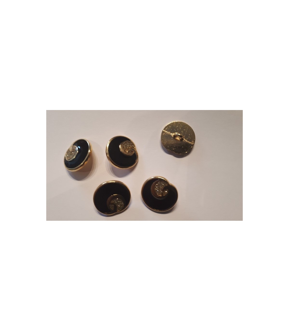 Goudkleurige metalen damesknoop. Zwart met goud. Doorsnee 18 mm.