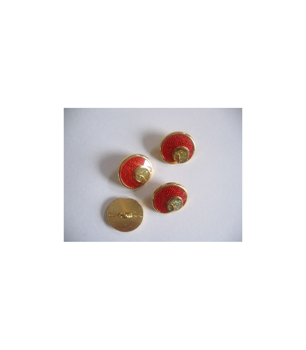 Goudkleurige metalen damesknoop. Rode knoop met zilveren glitter. Doorsnee 15 mm.
