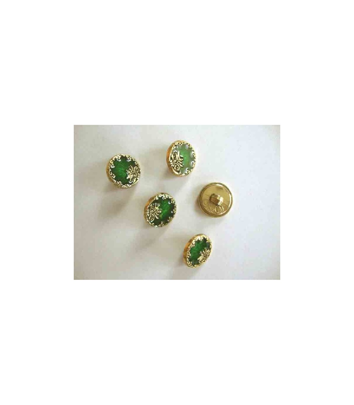 Een ronde, groen/goudkleurige kunststof dames knoop met een bloemrand.