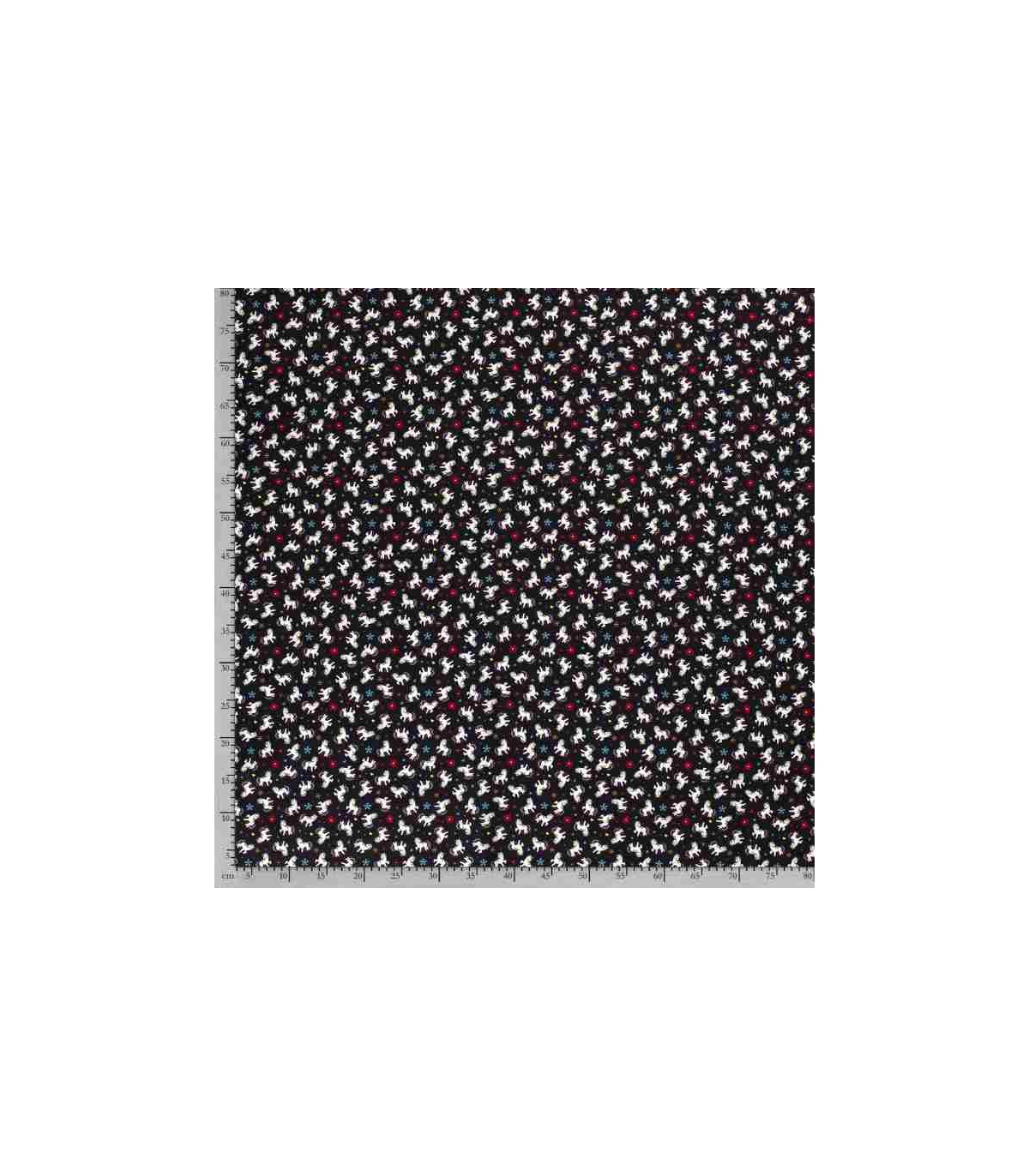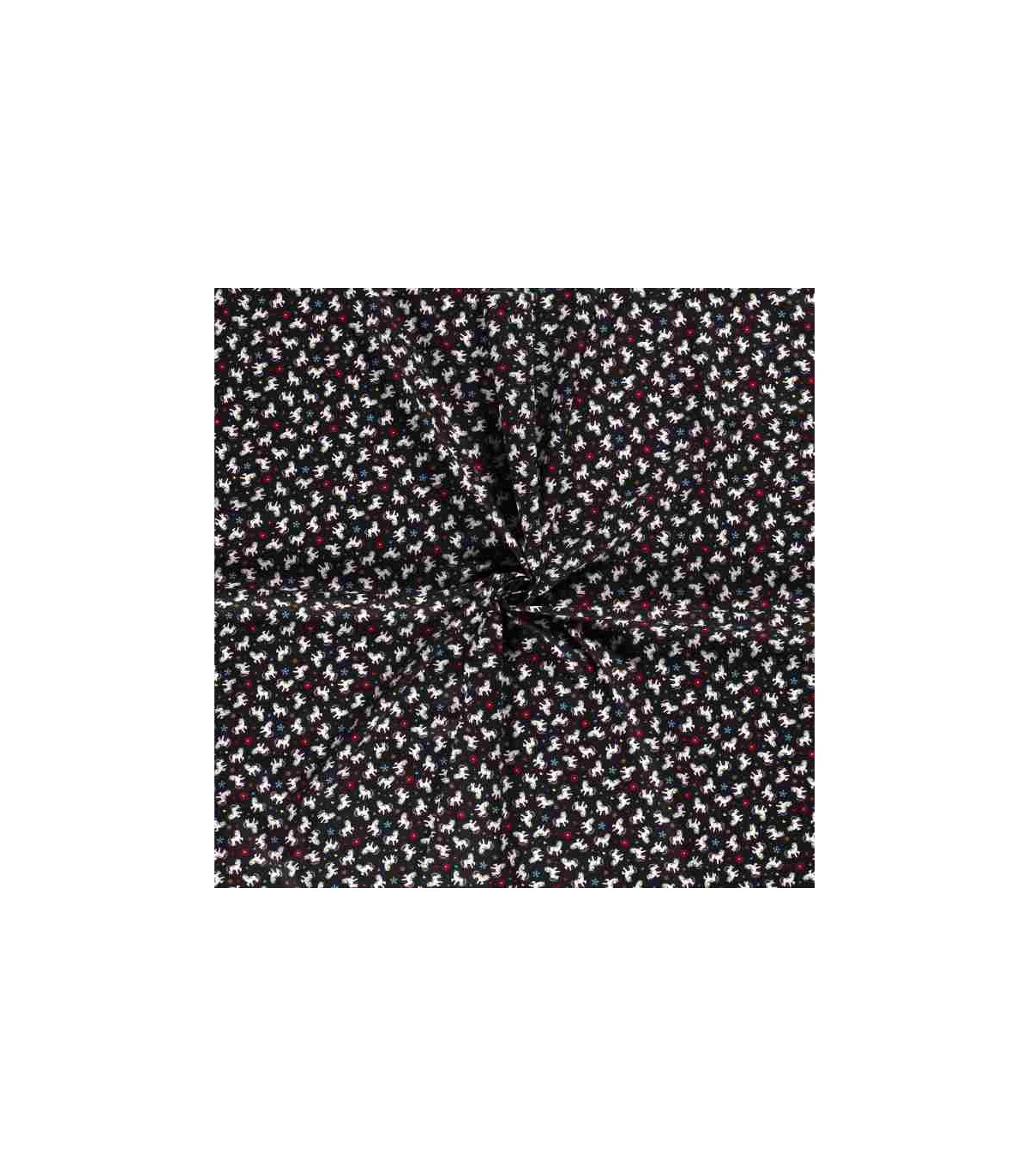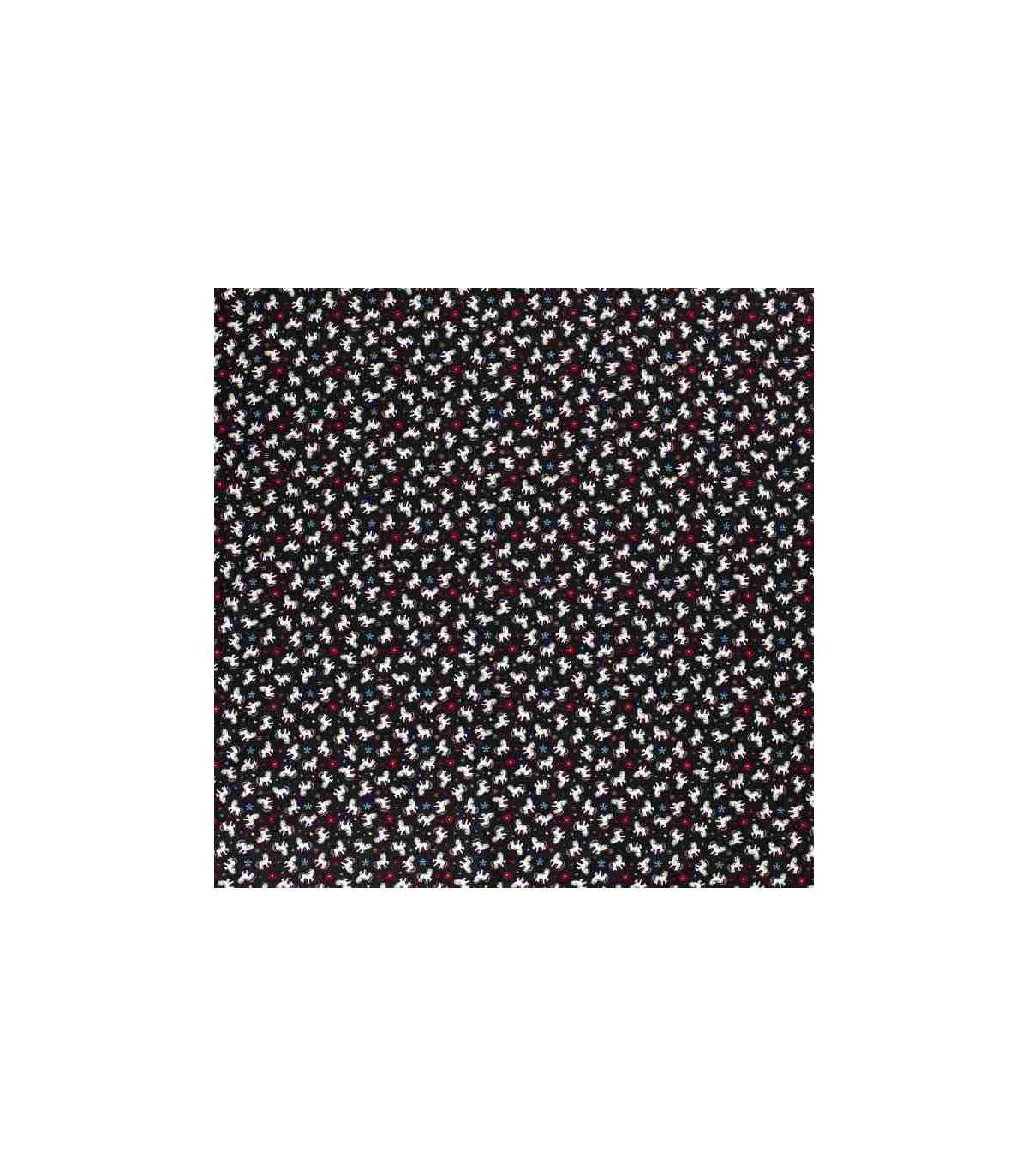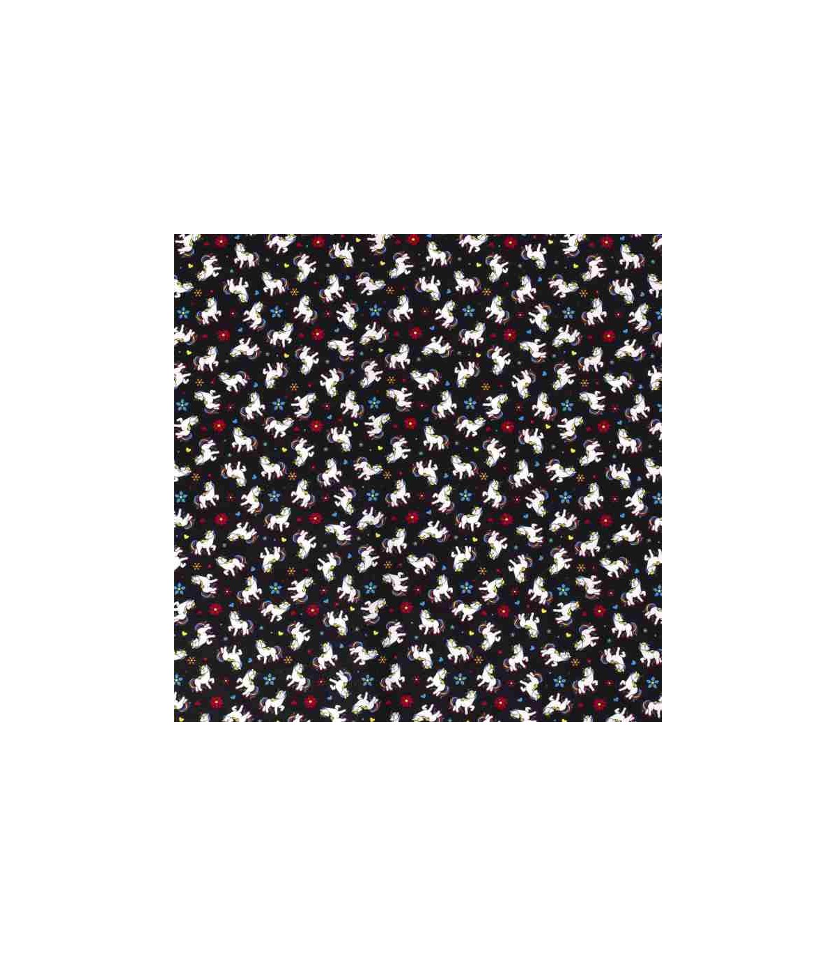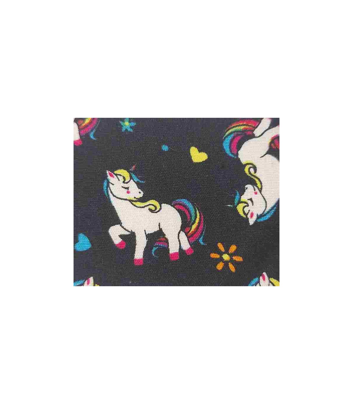 Een zwarte poplin/katoen met kleine witte eenhoorns, bloemen en hartjes.
