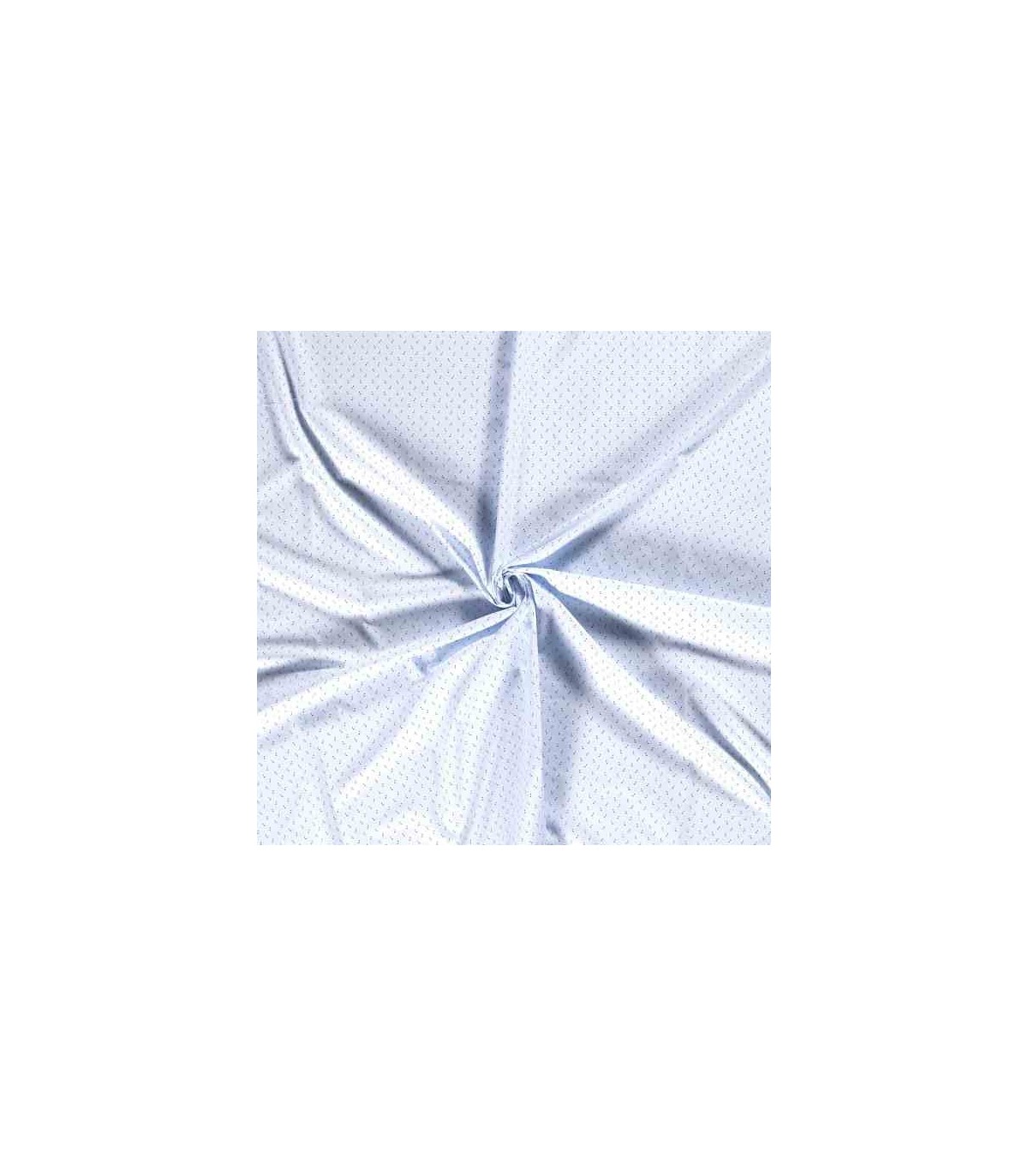 Een lichtblauwe poplin/katoen met een klein wit bloemetje. Past perfect bij de lichtblauwe  met boeketjes