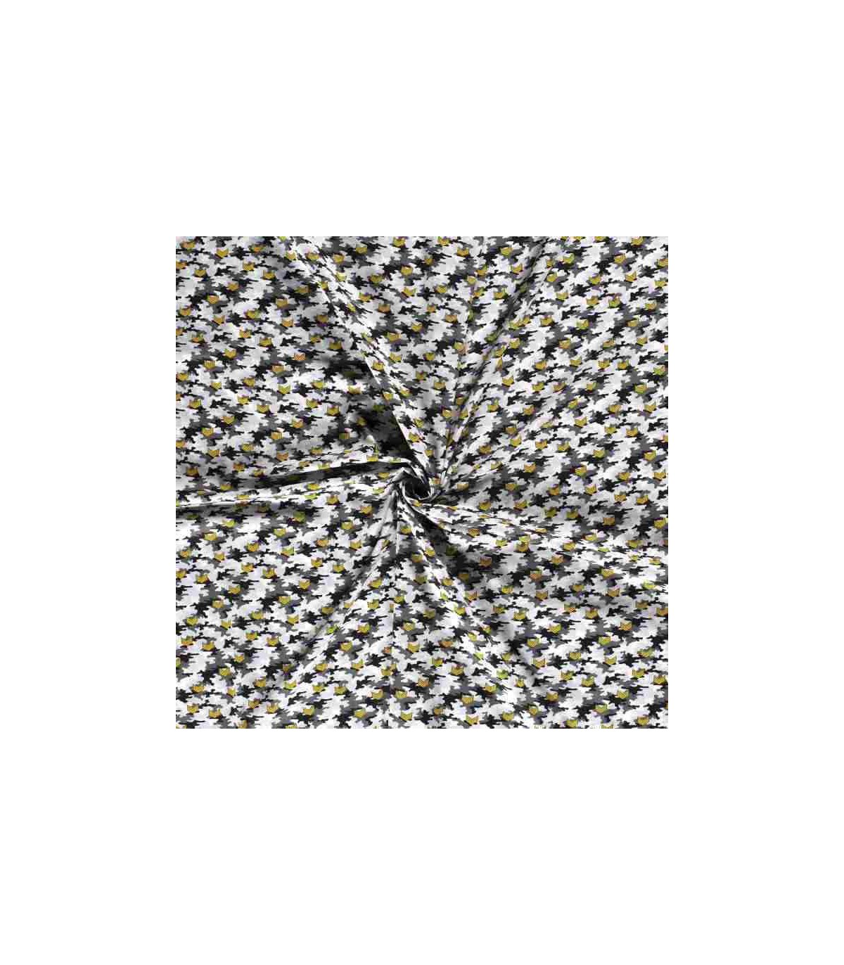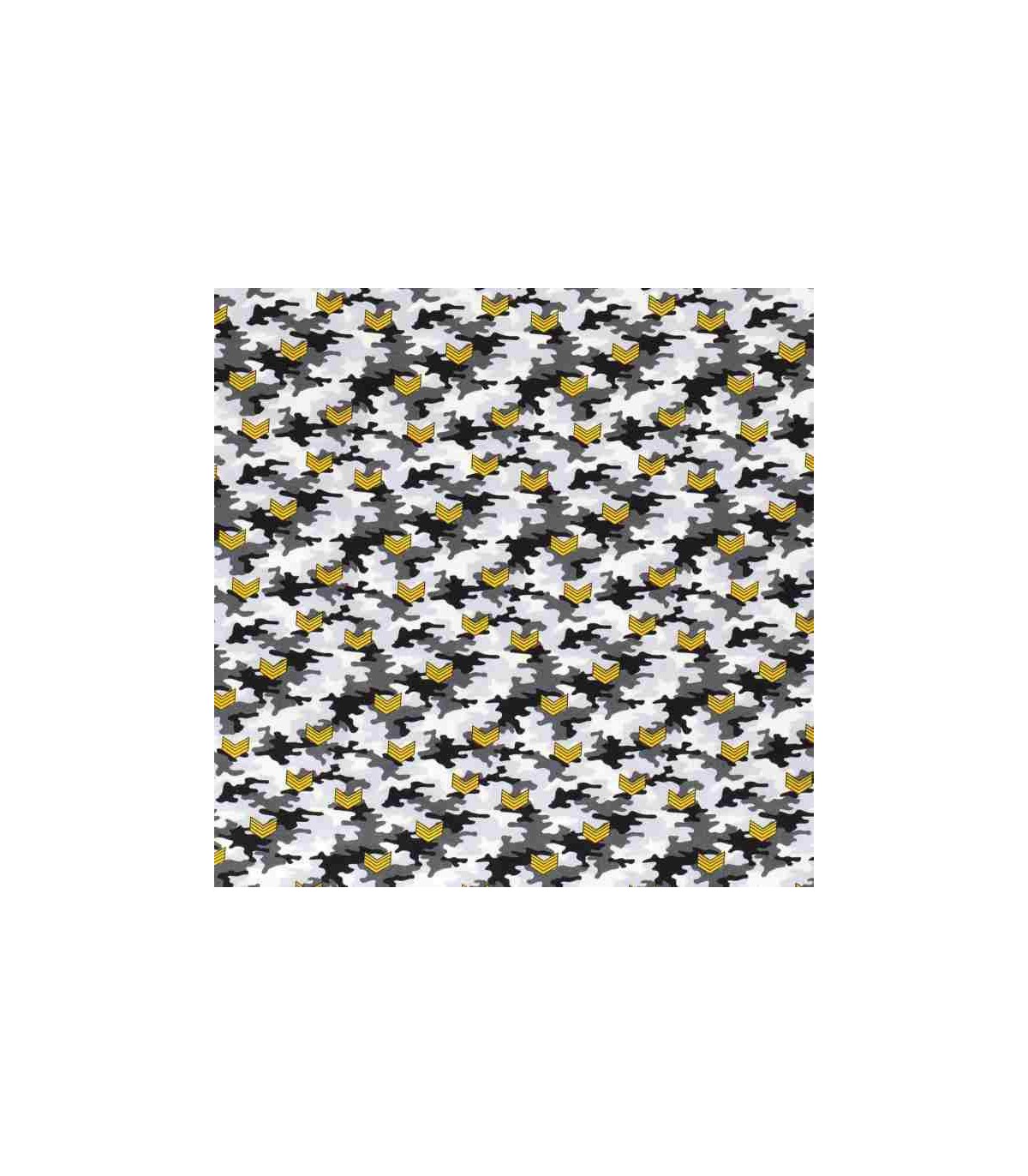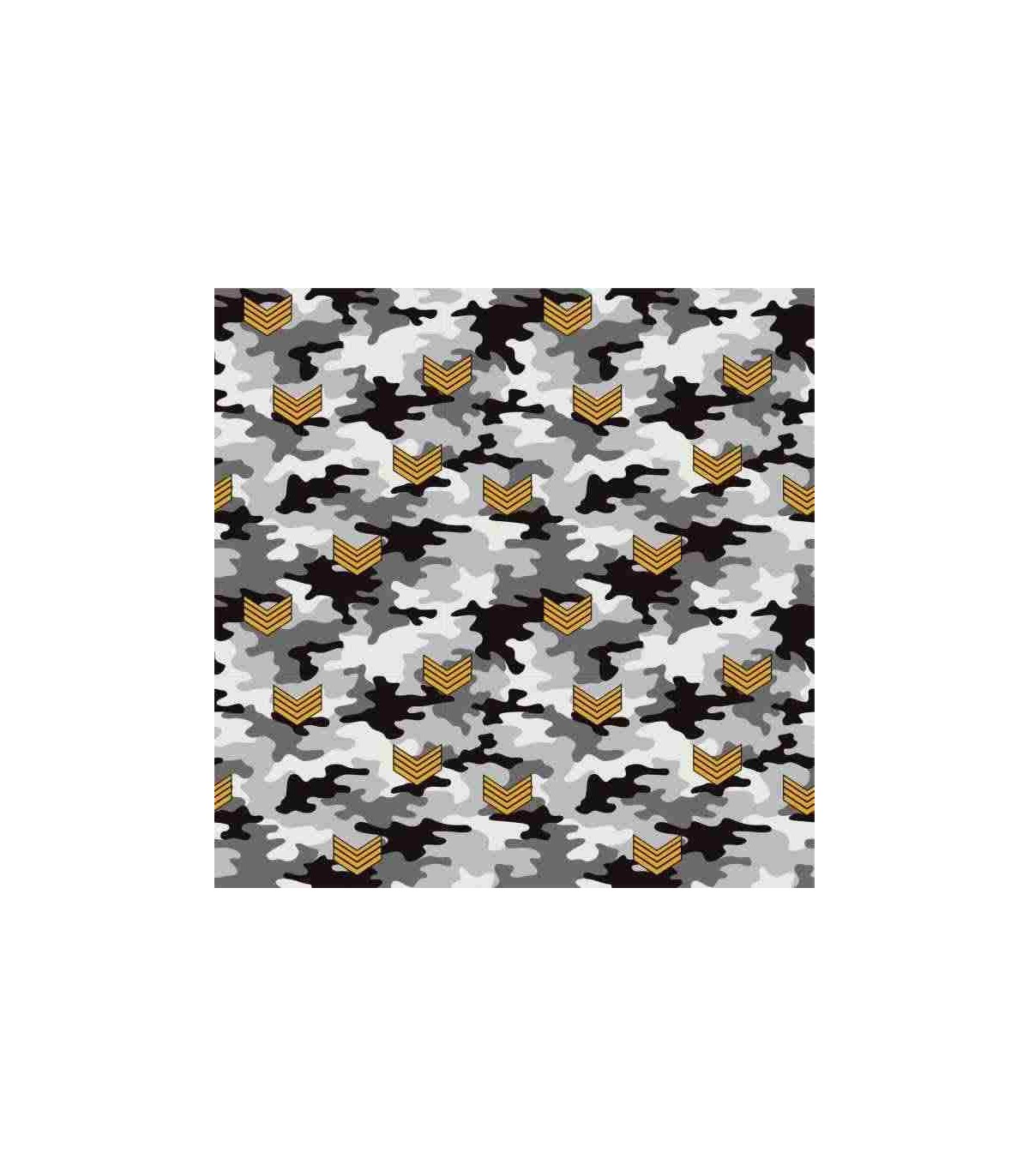 Een grijs,zwart,wit gekleurde camouflage print van poplin/katoen. Met een geel V embleem