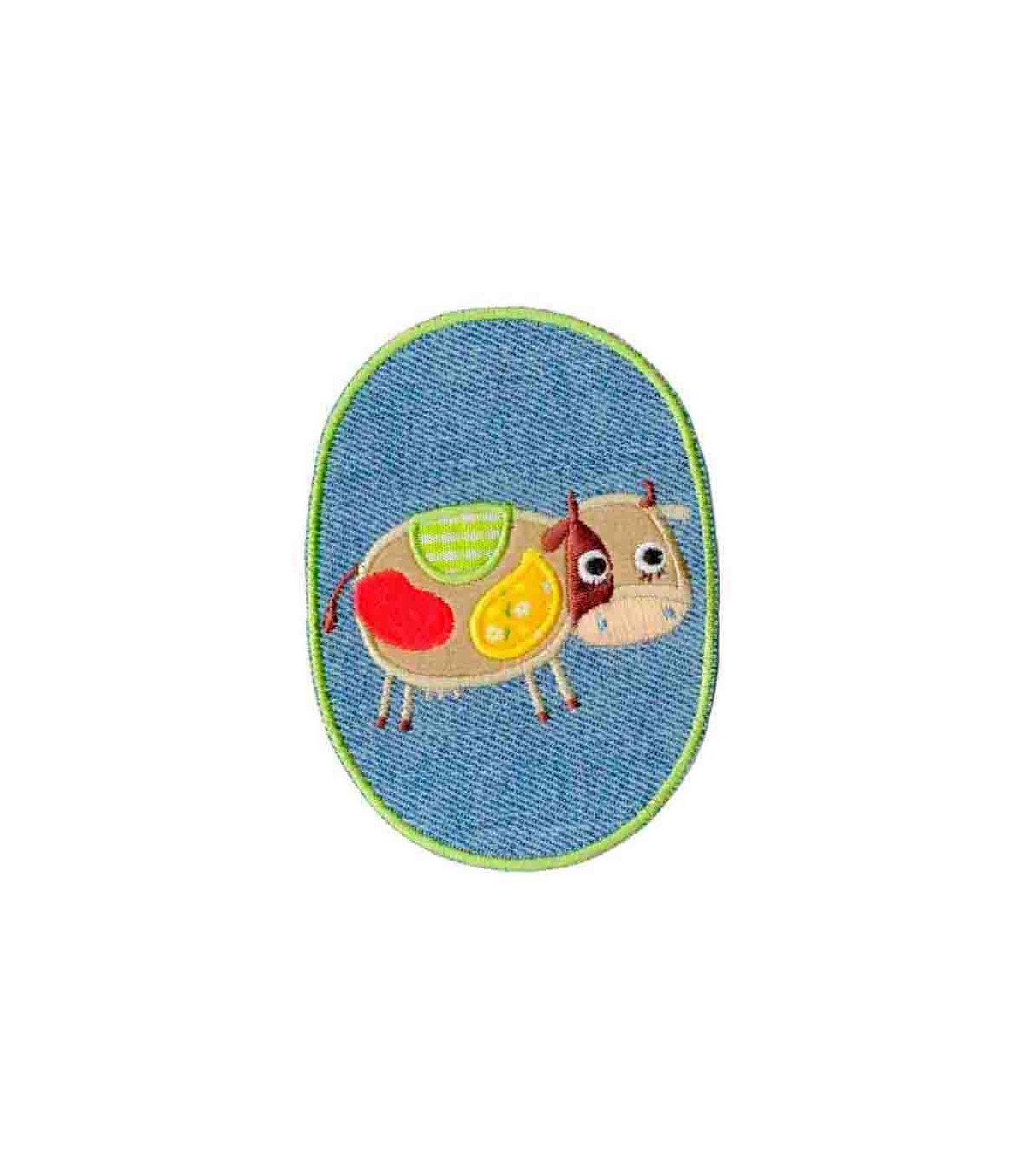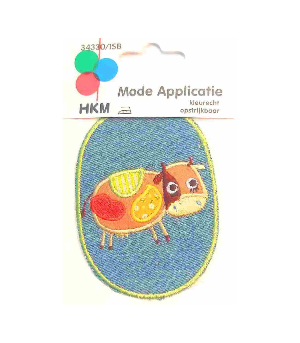 Opstrijkbare applicatie, midden jeans met helder rood randje.