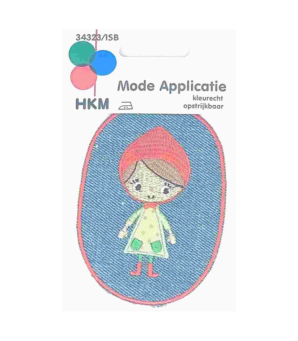 Opstrijkbare applicatie, midden jeans met boerin en rood randje.