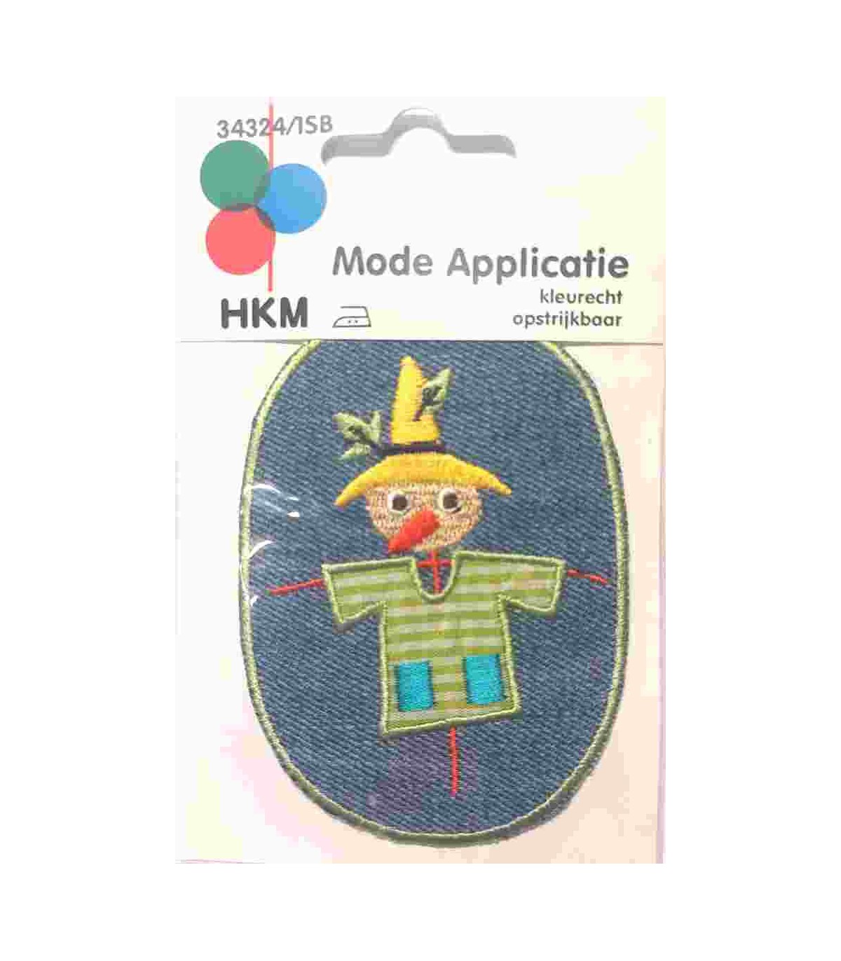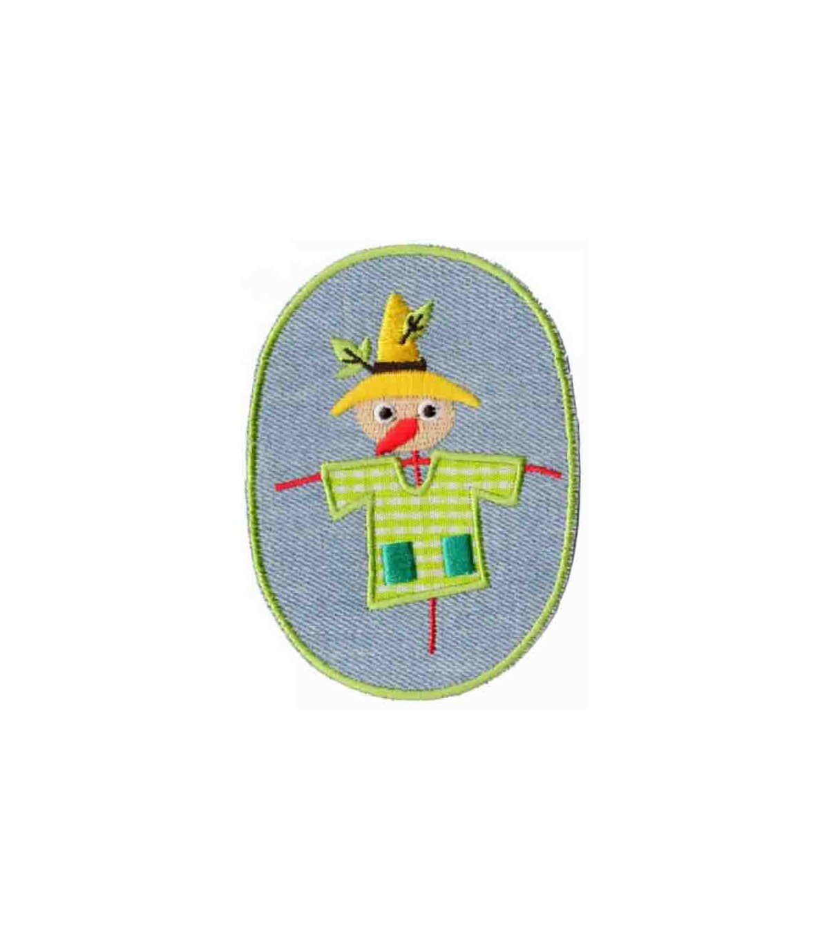 Opstrijkbare applicatie kniestuk jeans ovaal met vogelverschrikker en limegroen randje