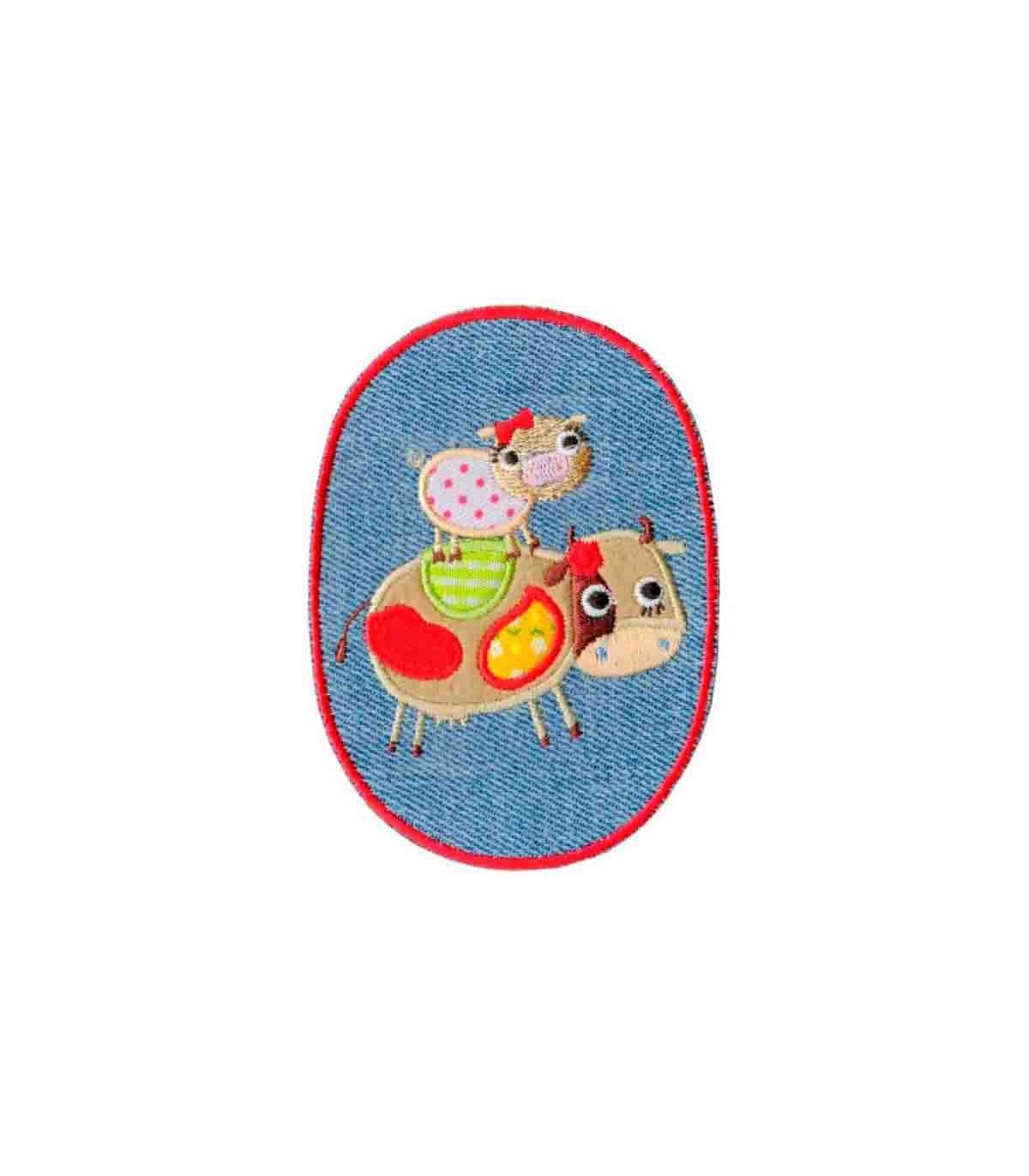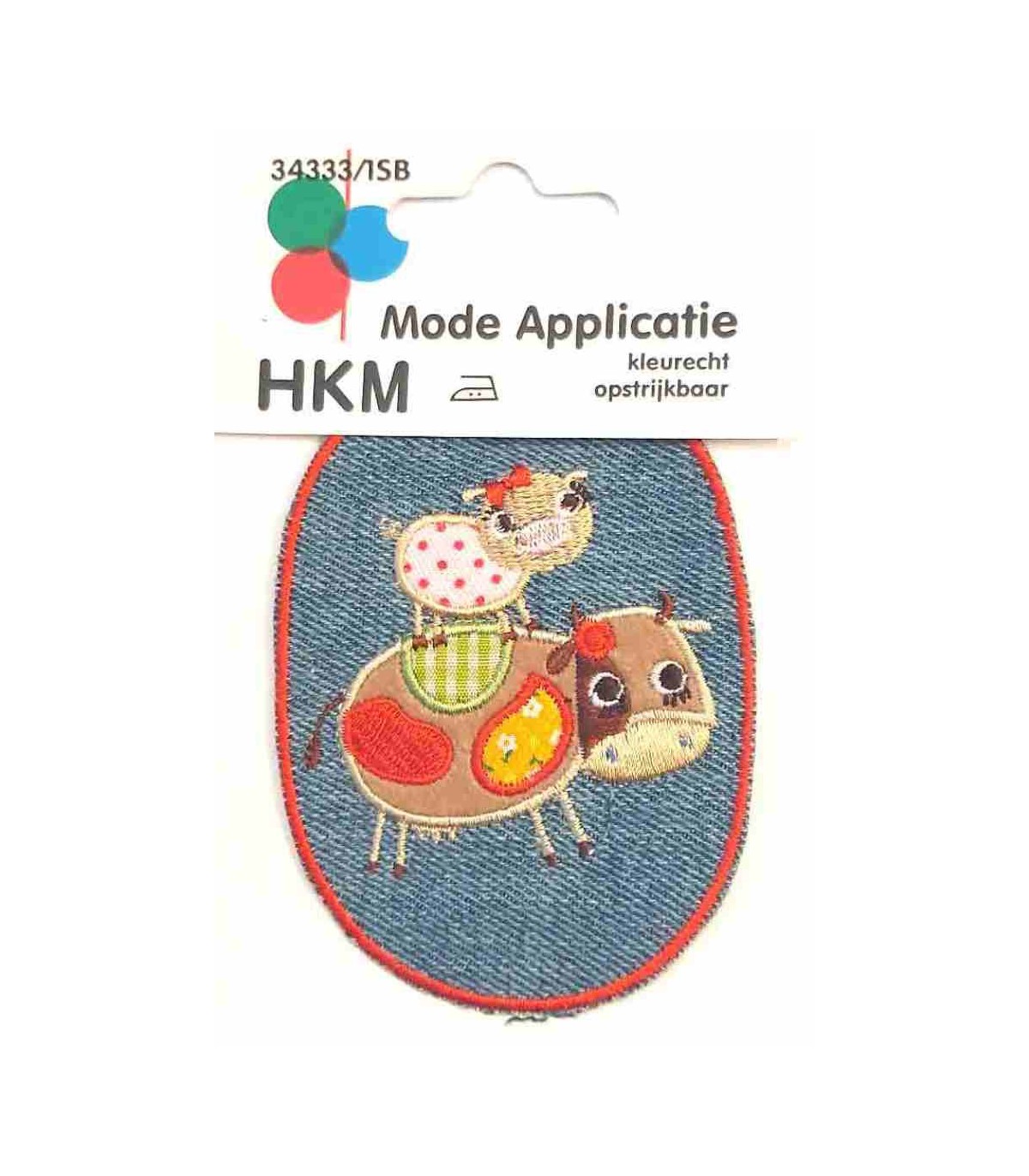 Opstrijkbare applicatie, midden jeans met helder rood randje.