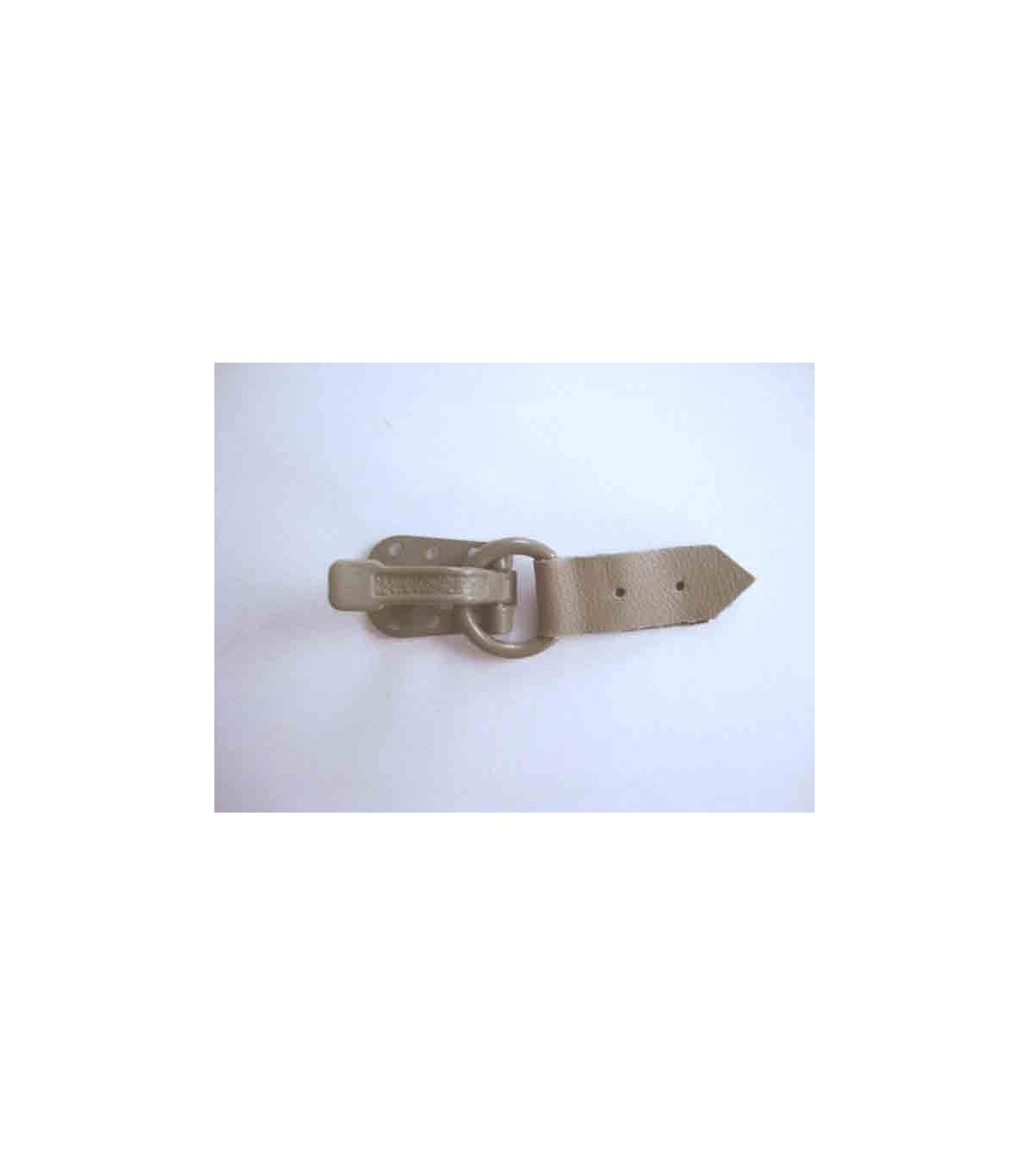 Een bonthaaksluitig met een zandkleurig flapje. Afmeting: 60x15mm.