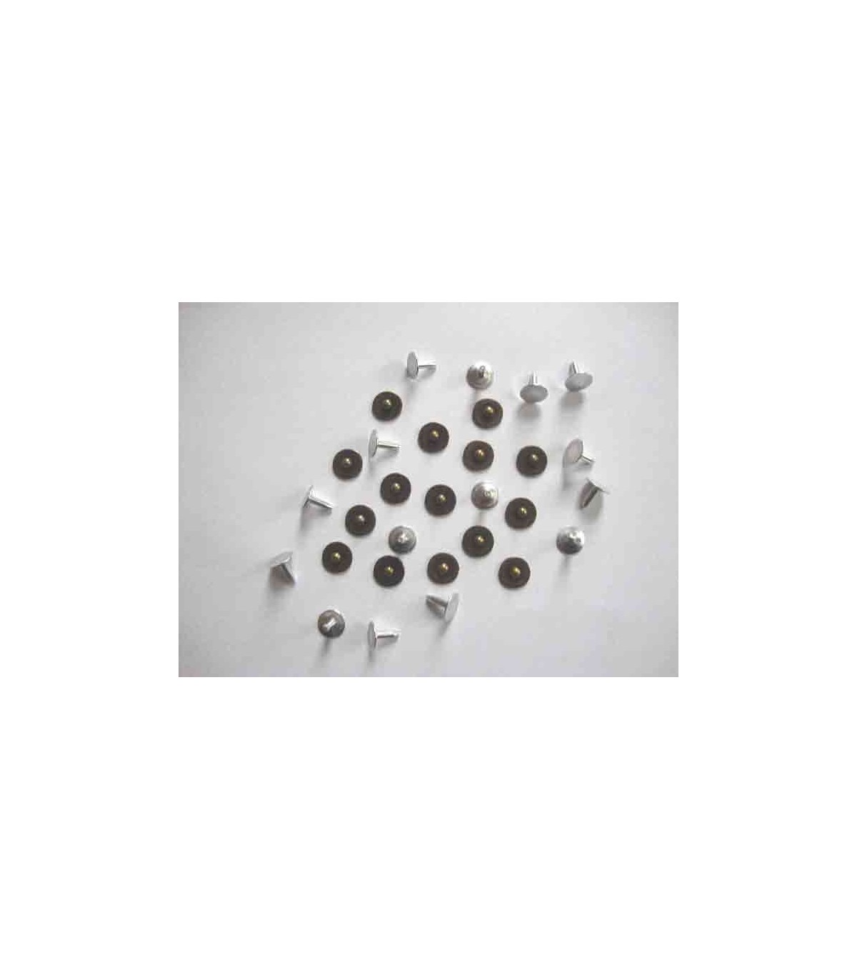 15 losse bronskleurige siernieten in een zakje. Zonder werktuig en werkbeschrijving. 9.8 mm. doorsnee