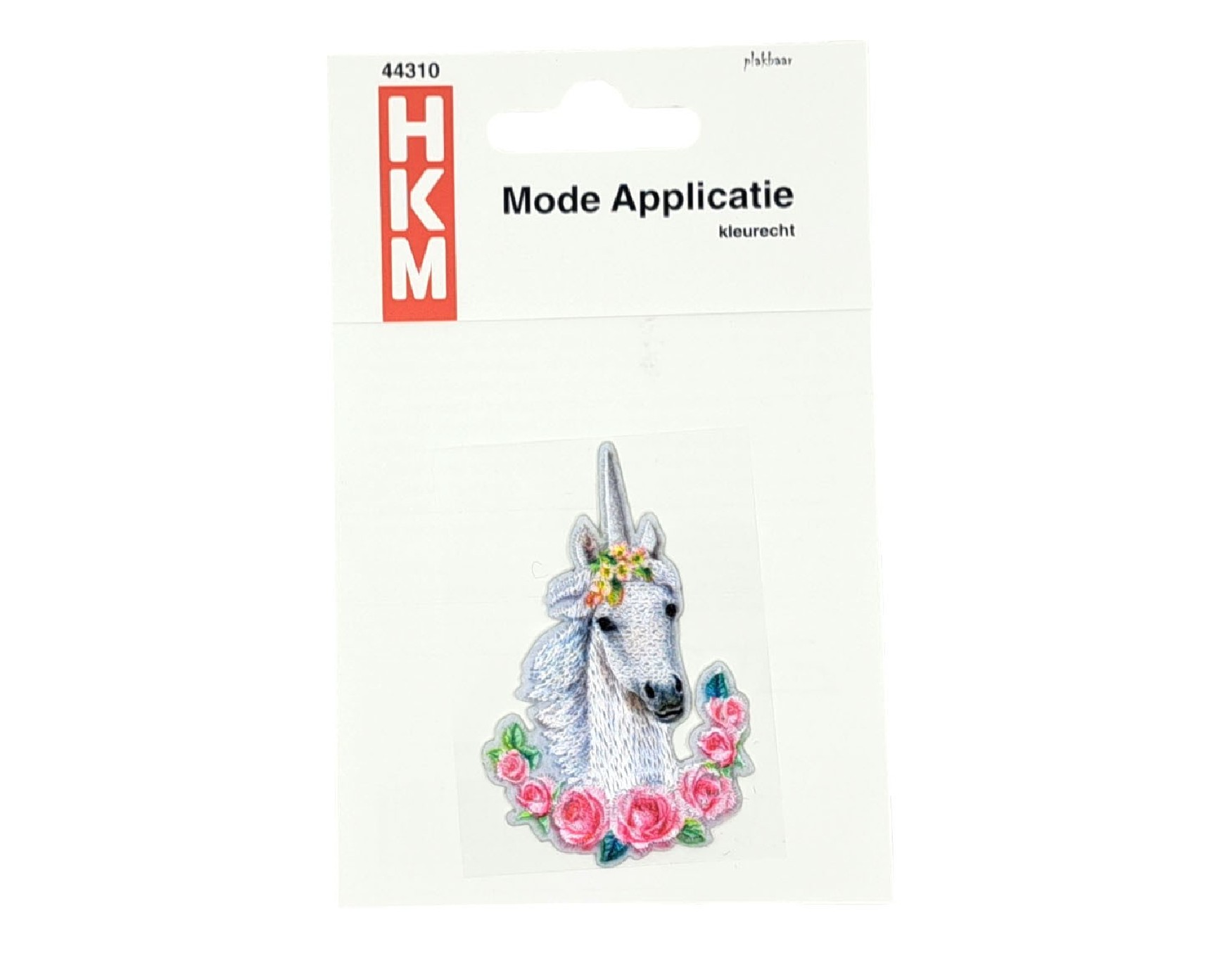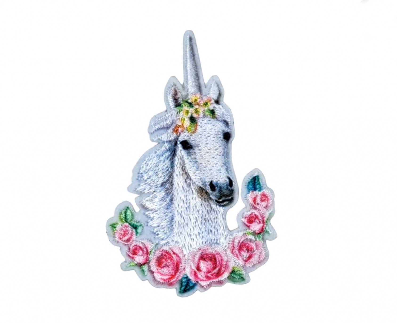 Een opstrijkbare eenhoorn applicatie met een krans van rozen