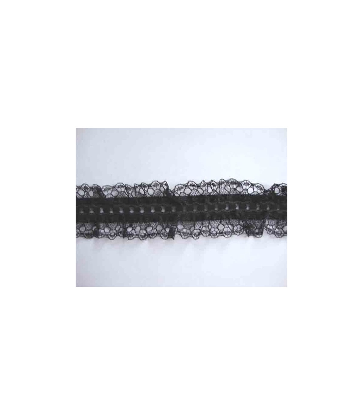 2 zijdig zwart elastisch kant. Door de gaatjes in het midden kunt u eventueel een satijnlintje van max 6 mm. rijgen. Wel gaat de rek er dan uit.