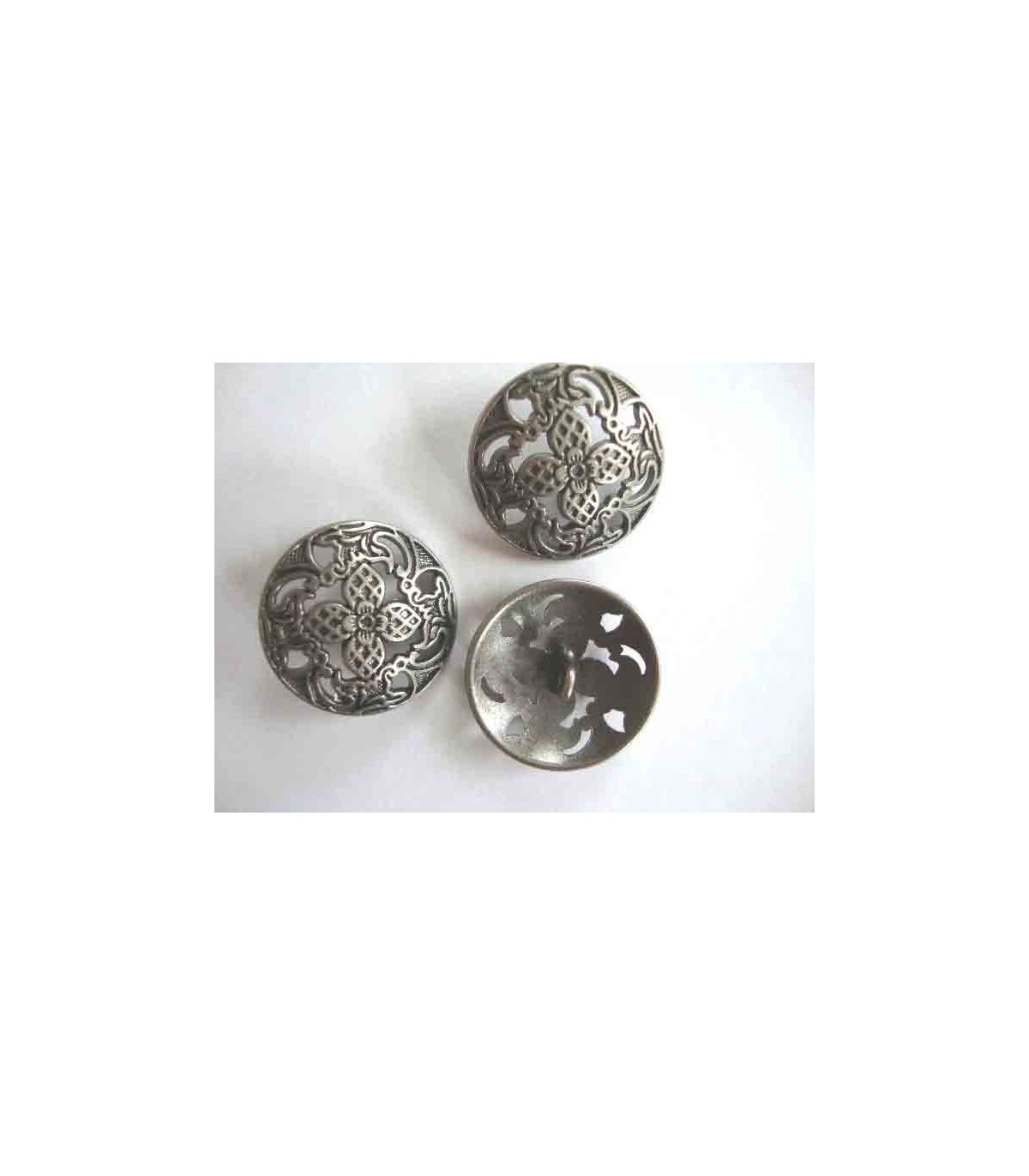 Een exclusieve oudzilverkleurige metalen knoop, opengewerkt met bloem motief.