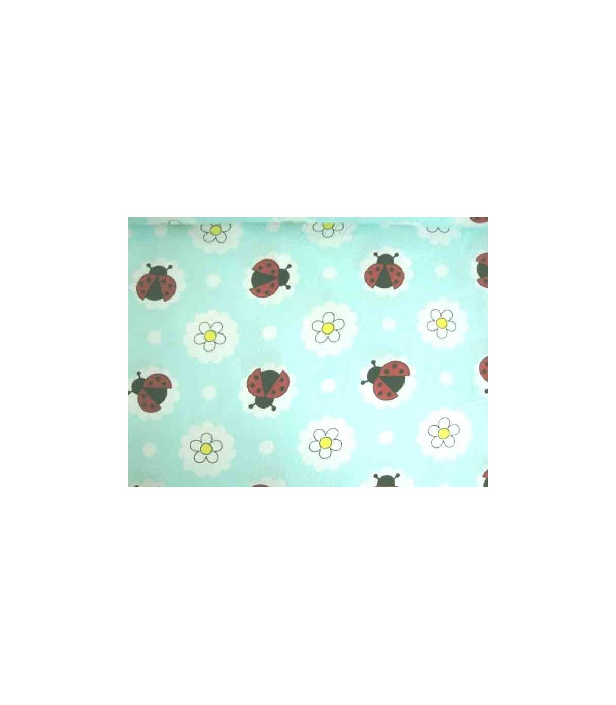 Een mintgroene poplin katoen met lieveheersbeestjes in een wolkje. De wolkjes hebben een doorsnee van 5 cm.