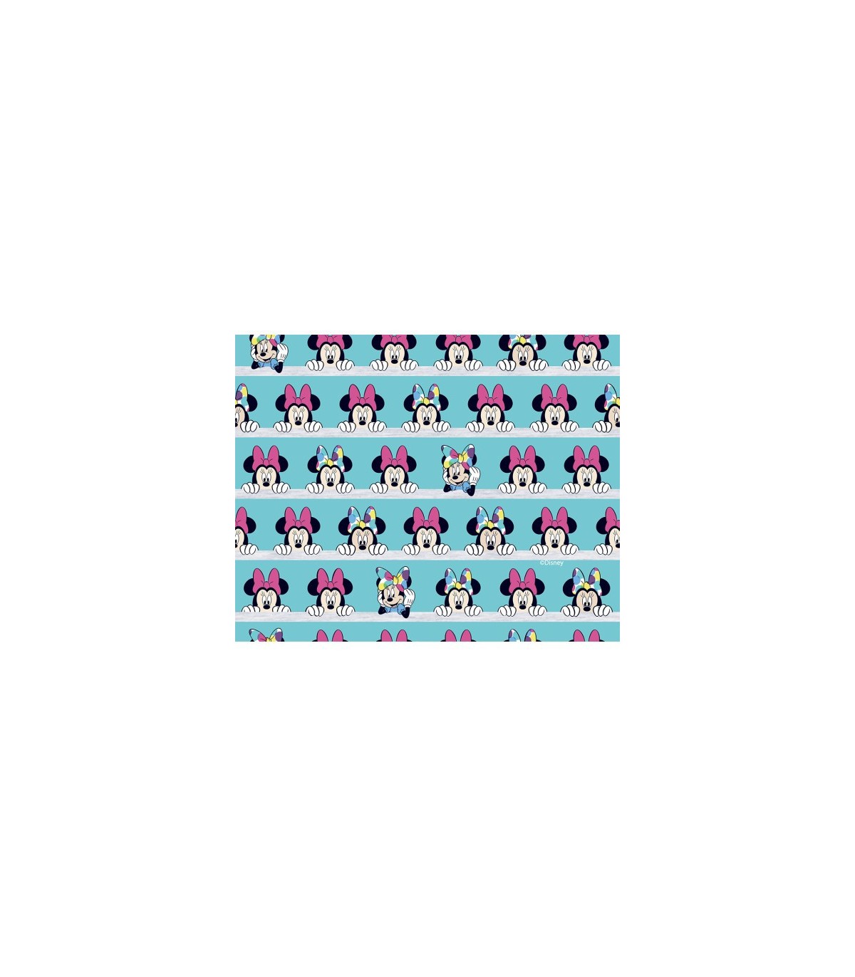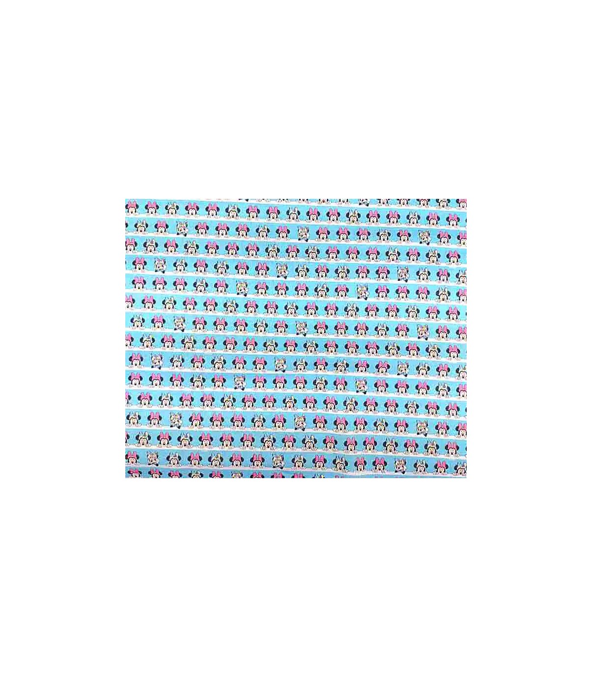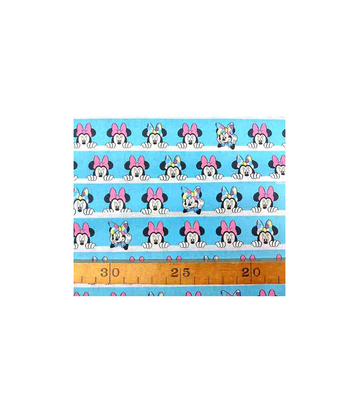 Een aqua kleurige poplin/katoen. Breedtestreep met een glurende Minnie Mouse