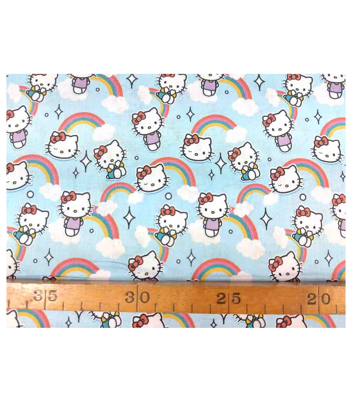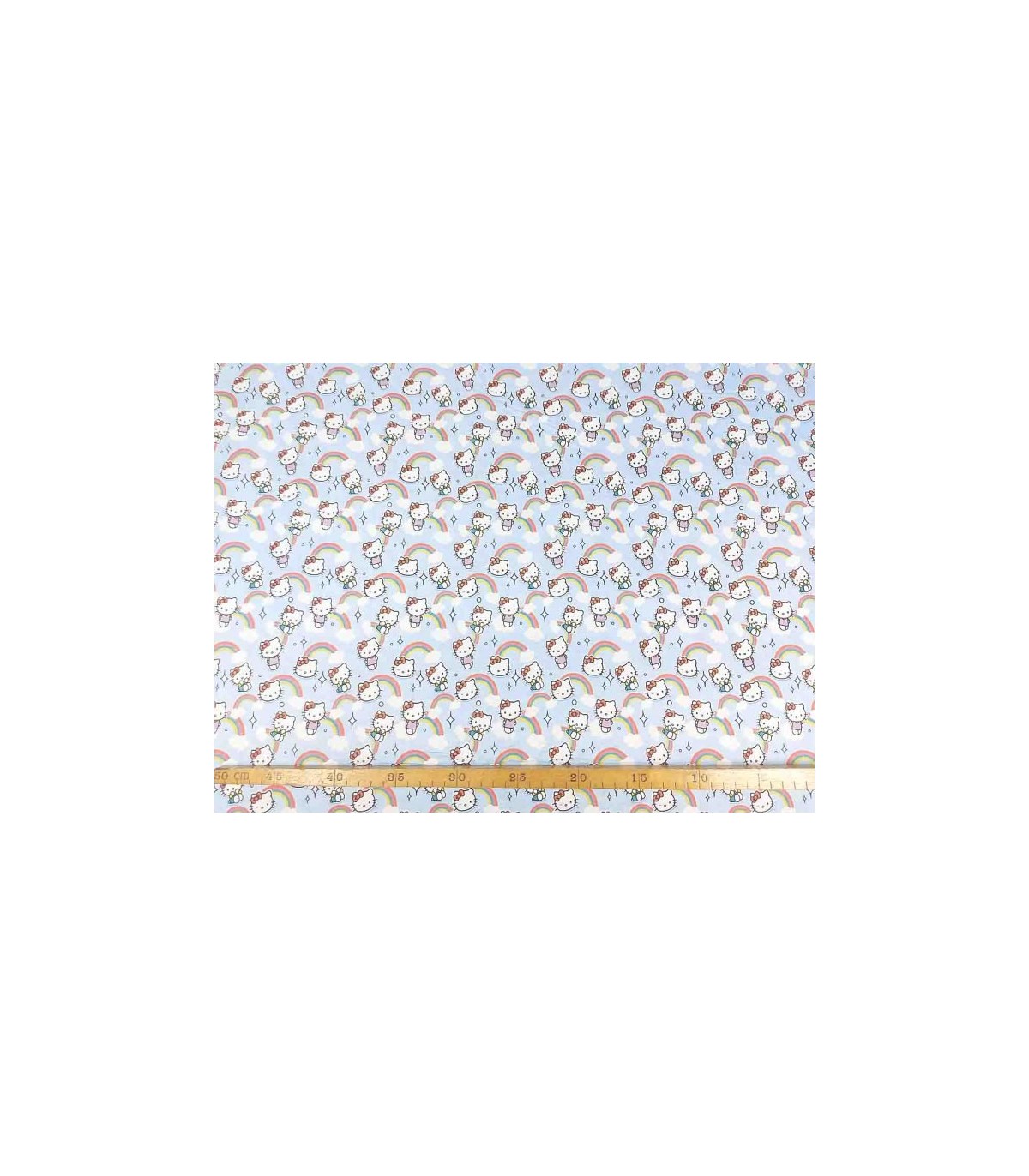 Een lichtblauwe poplin/katoen met Hello Kitty en regenbogen