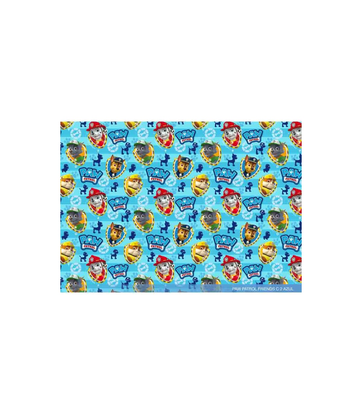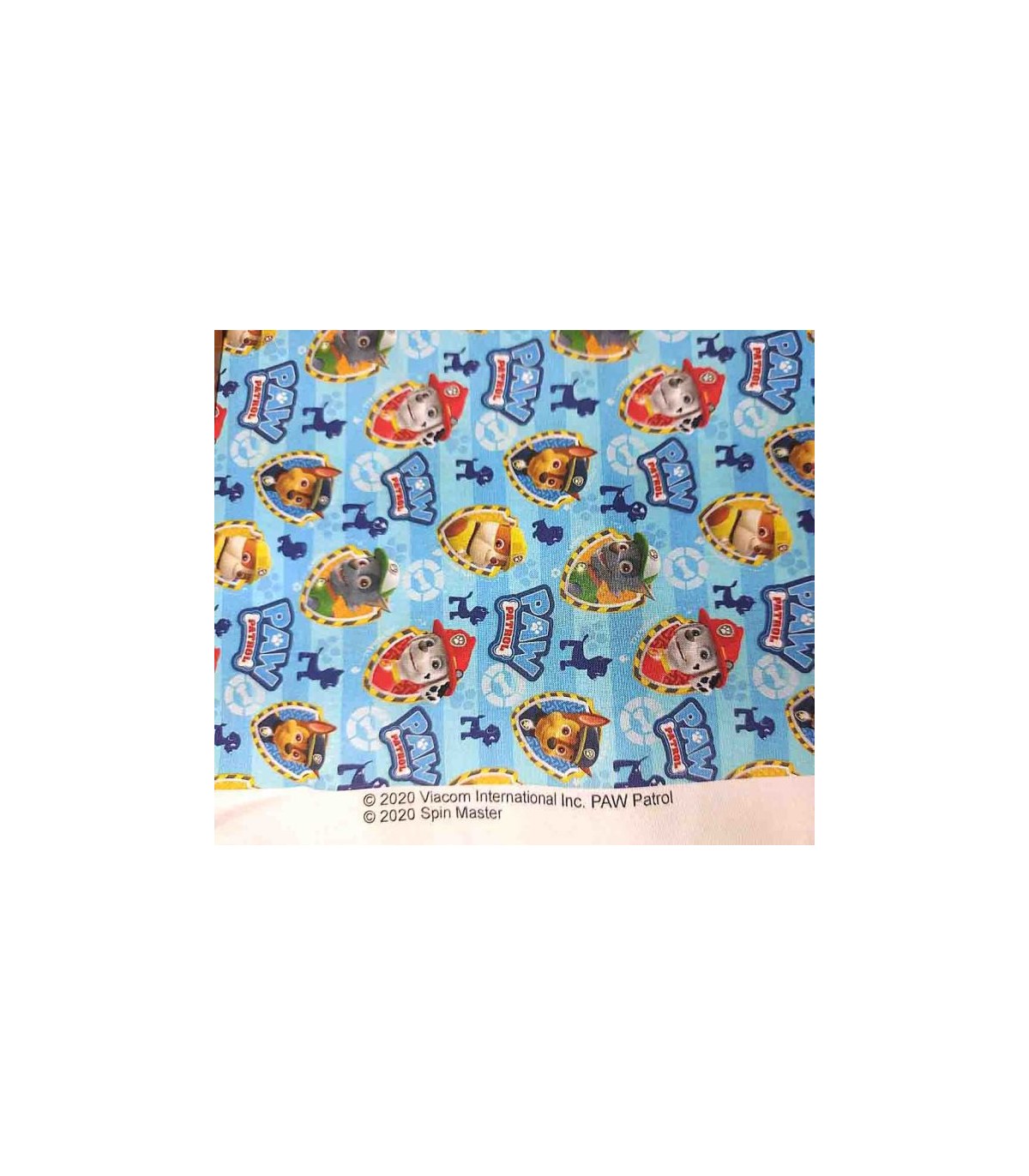 Een lichtblauw/witte poplin/katoenen breedtestreep met Paw Patrol Dog gezichtjes op schildjes