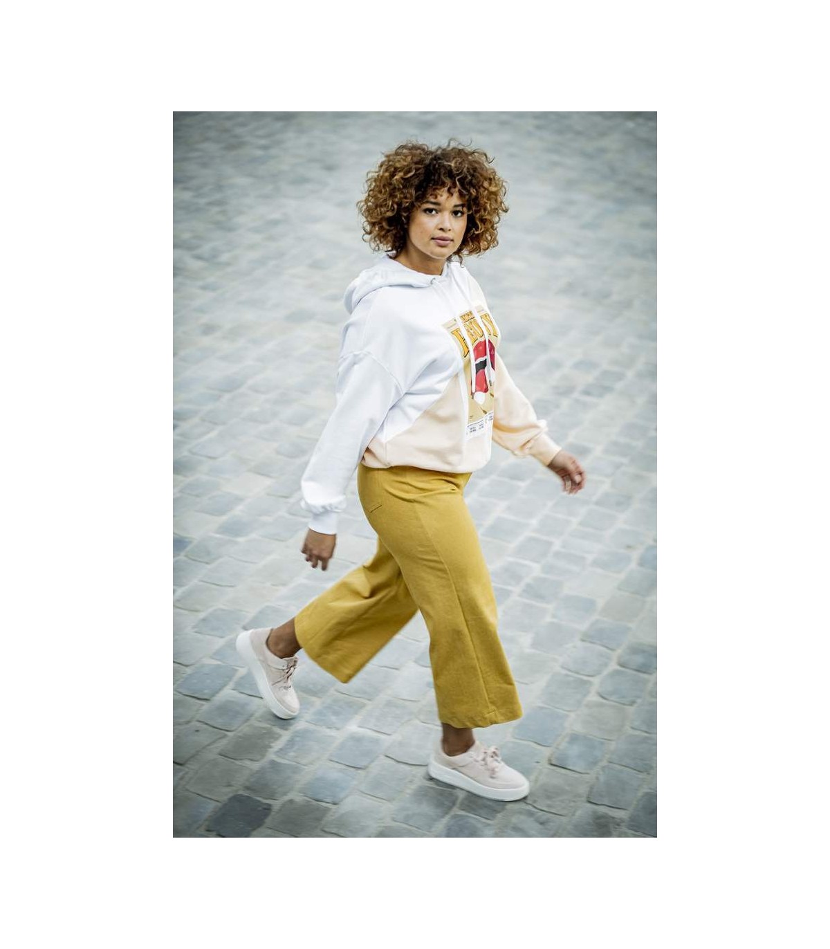 Een denim stof met een beetje stretch. Kleur zonnebloem geel.