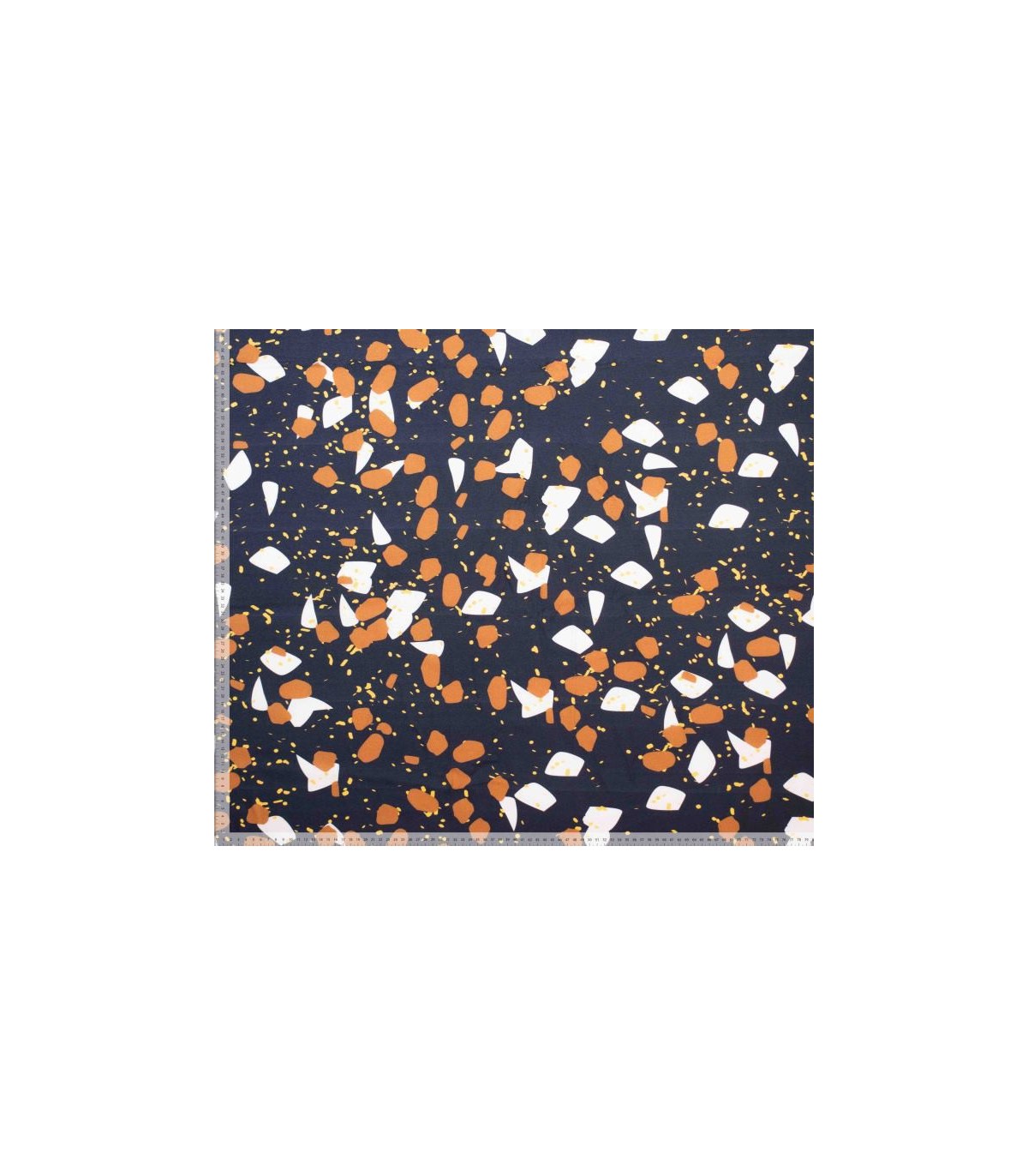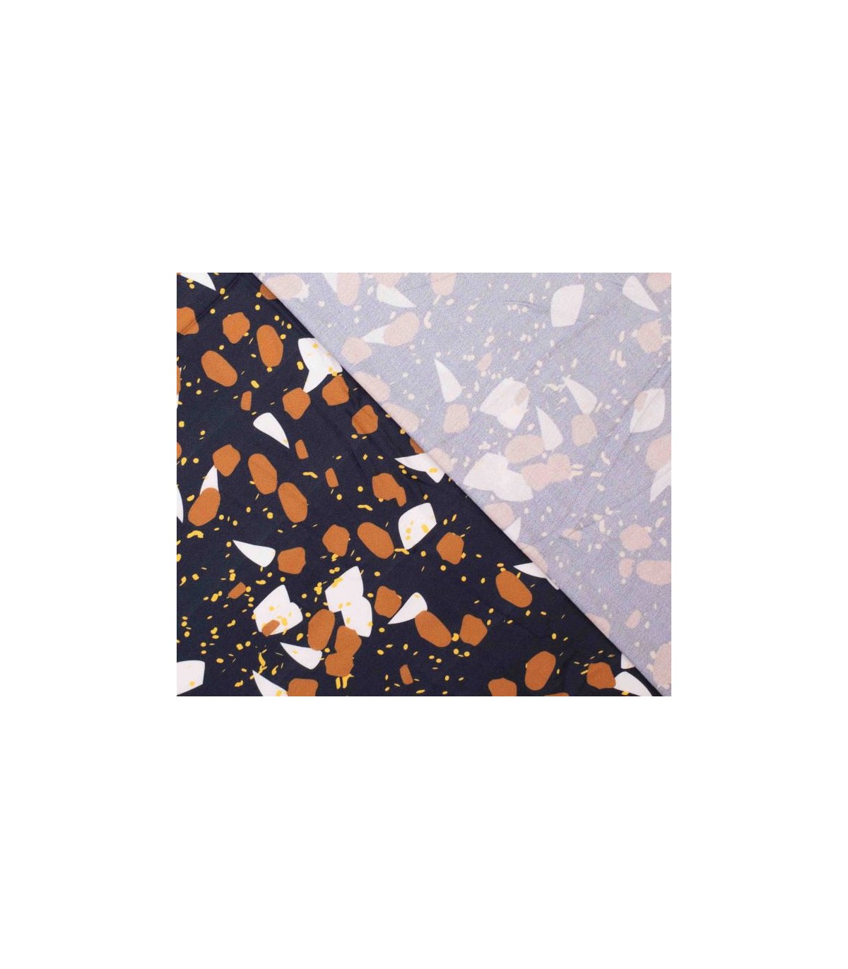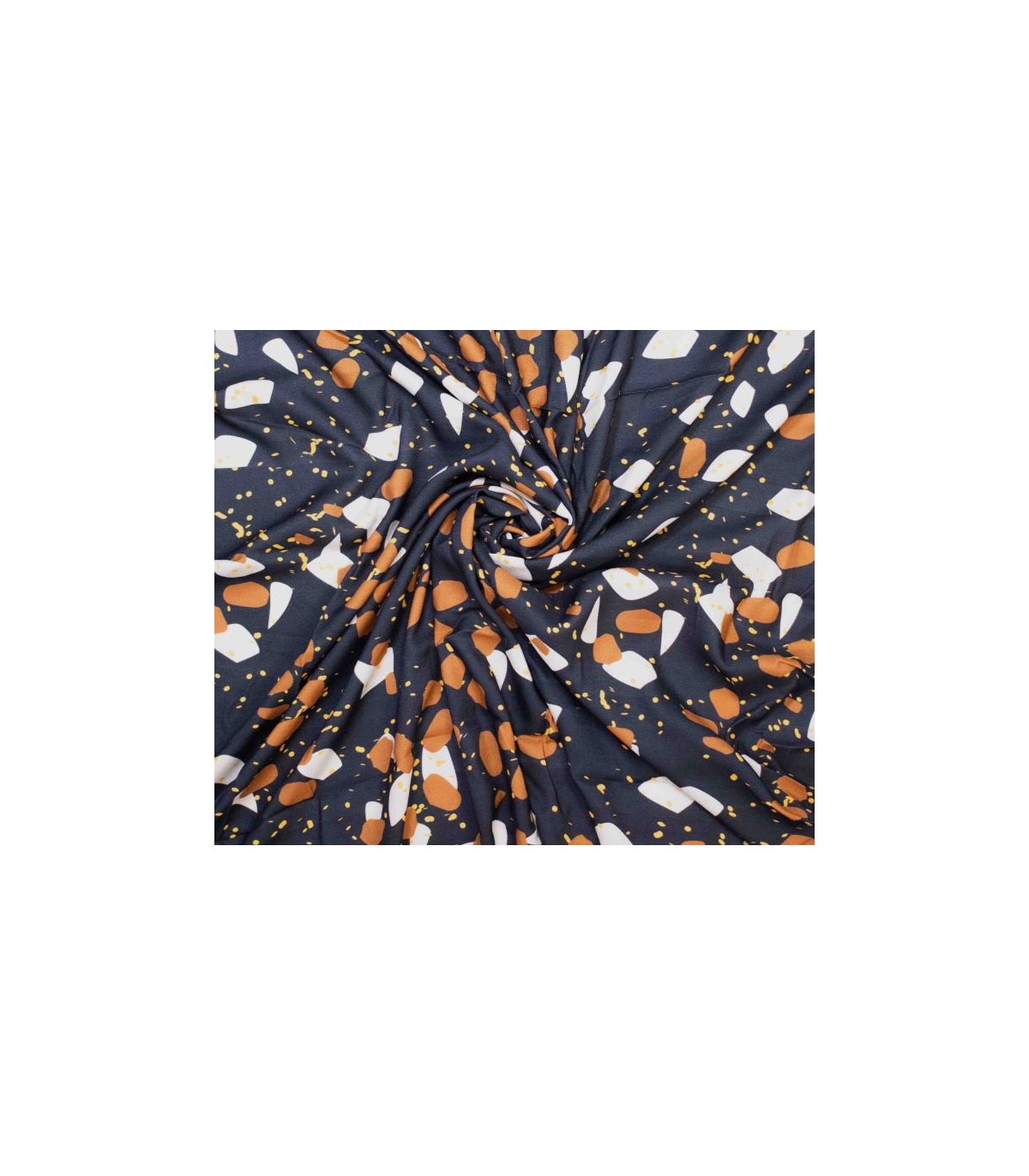 Een zwarte crepe viscose, met bruine en witte vlokken print