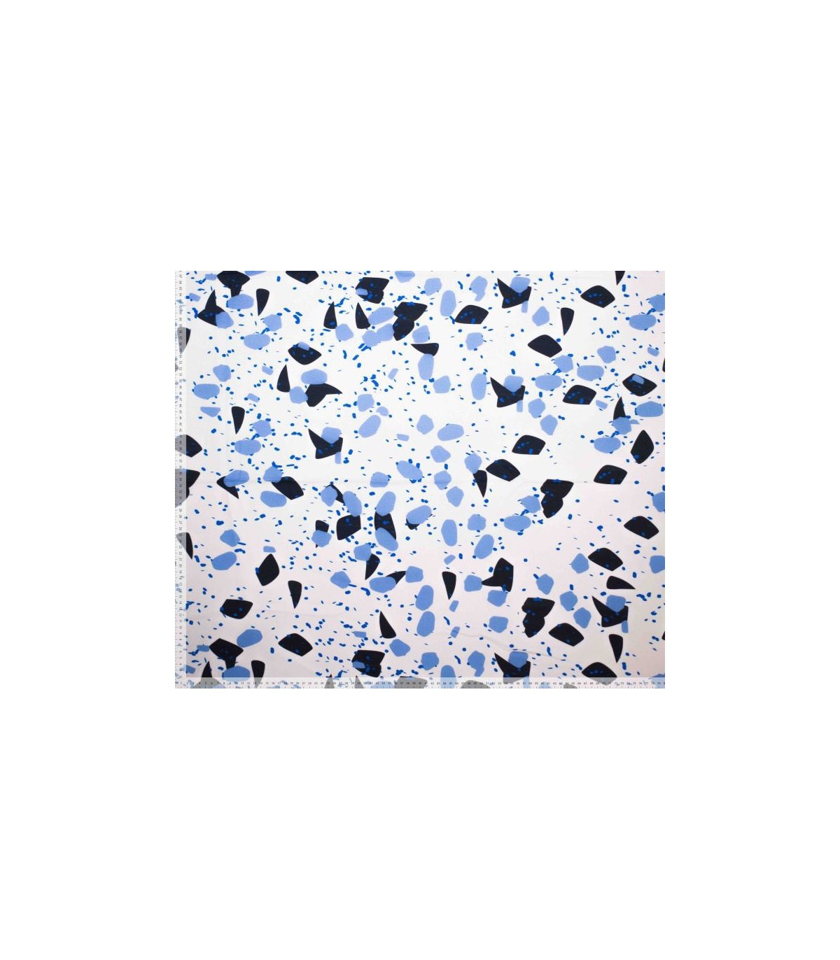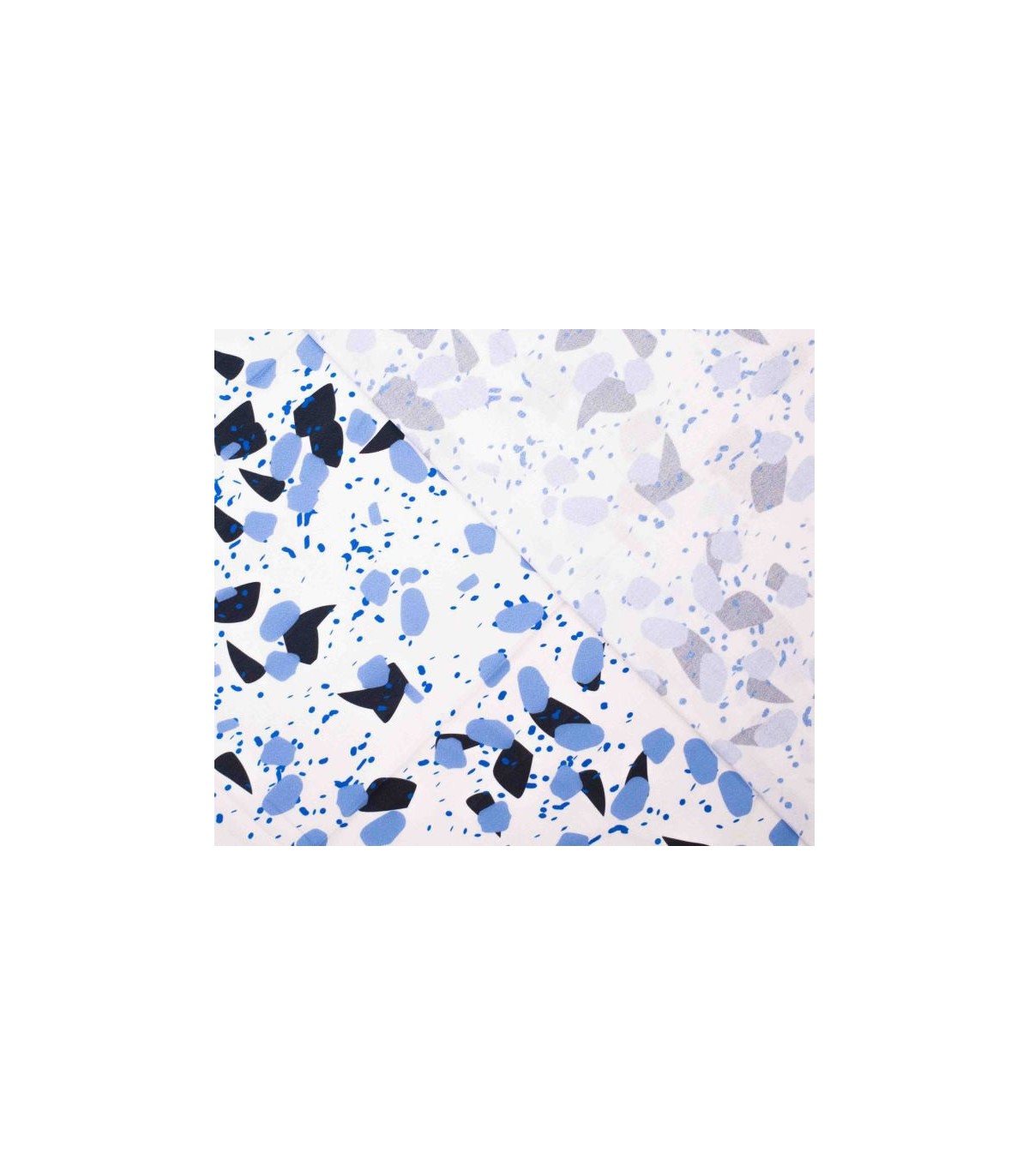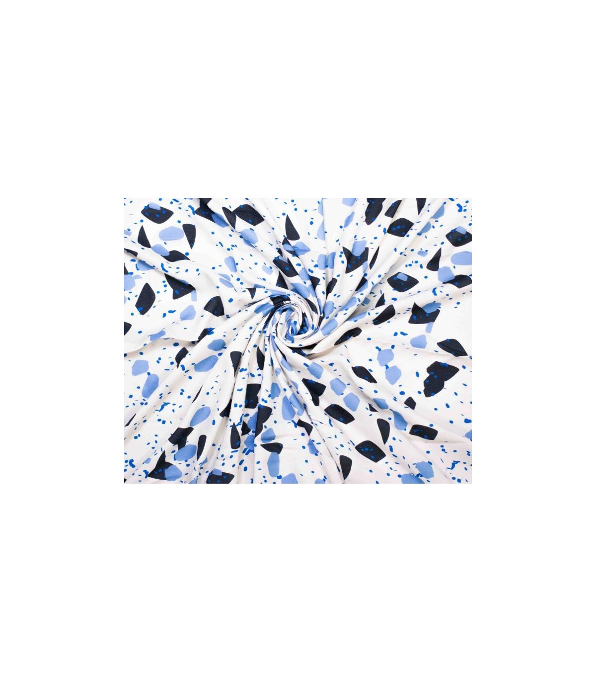 Een witte crepe viscose, met zwarte en blauwe vlokken print
