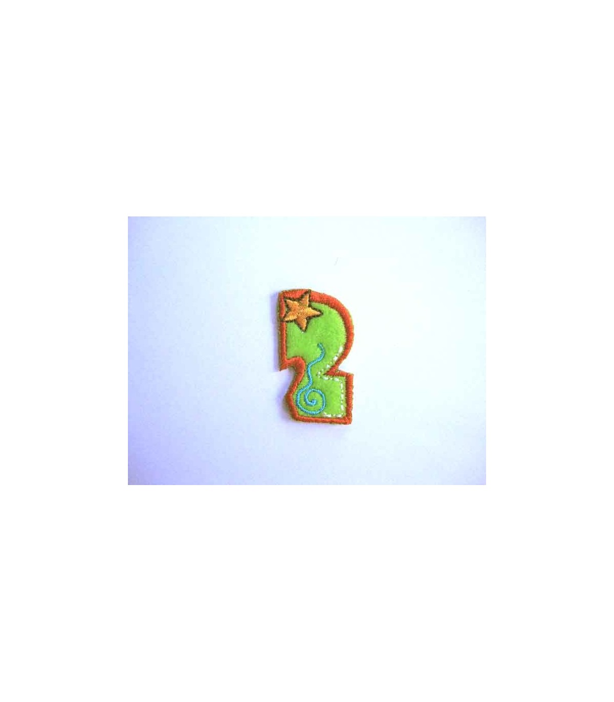 Een opstrijkbare applicatie met een doorsnee van zo'n 3 cm.