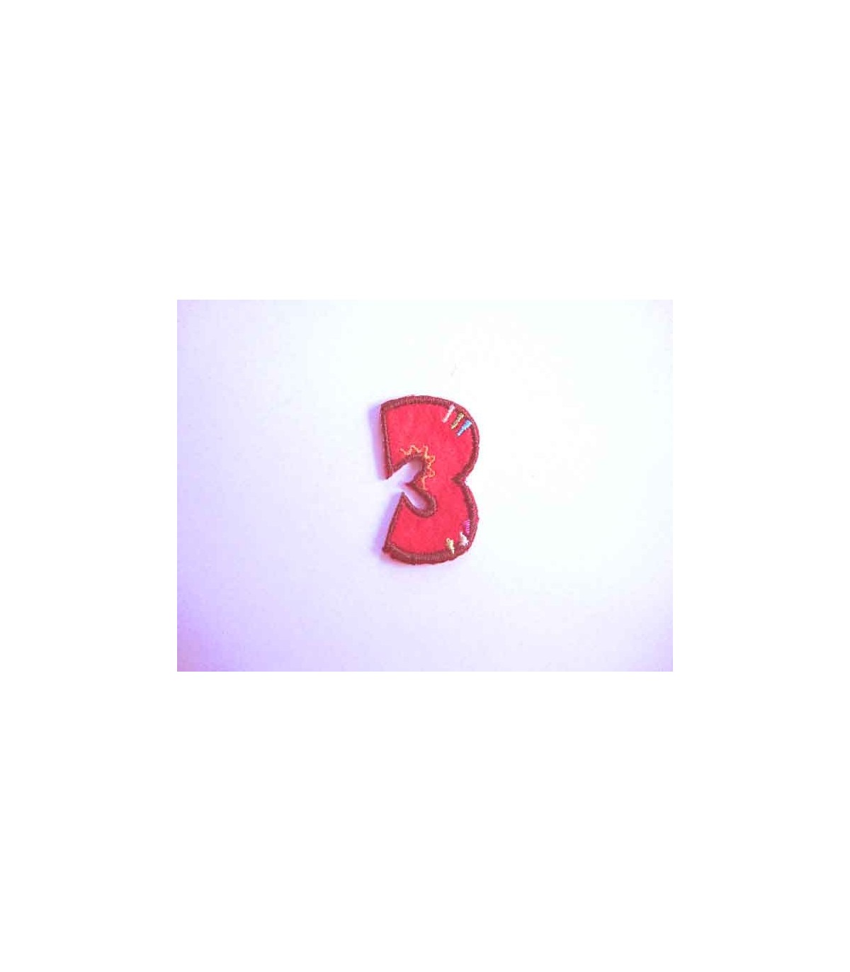 Een opstrijkbare applicatie met een doorsnee van zo'n 3 cm.